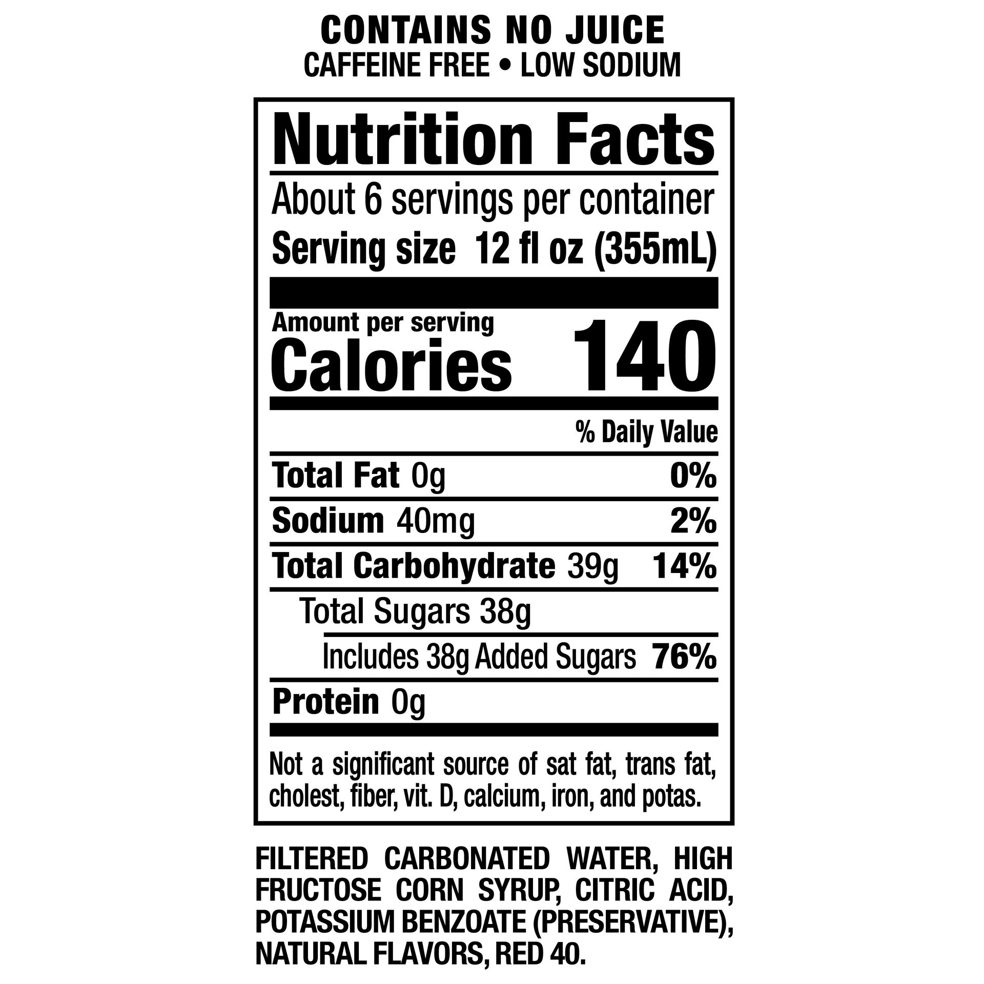 Filtered Carbonated Water, High Fructose Corn Syrup, Citric Acid, Potassium Benzoate (Preservative), Natural Flavors, Red 40.