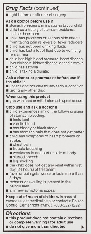In Each 5 mL: Active Ingredients: *Ibuprofen (NSAID) (100 mg), Pain Reliever/Fever Reducer. Inactive Ingredients: Anhydrous Citric Acid, D&C Red 33, FD&C Blue 1, FD&C Red 40, Glycerin, High Fructose C…