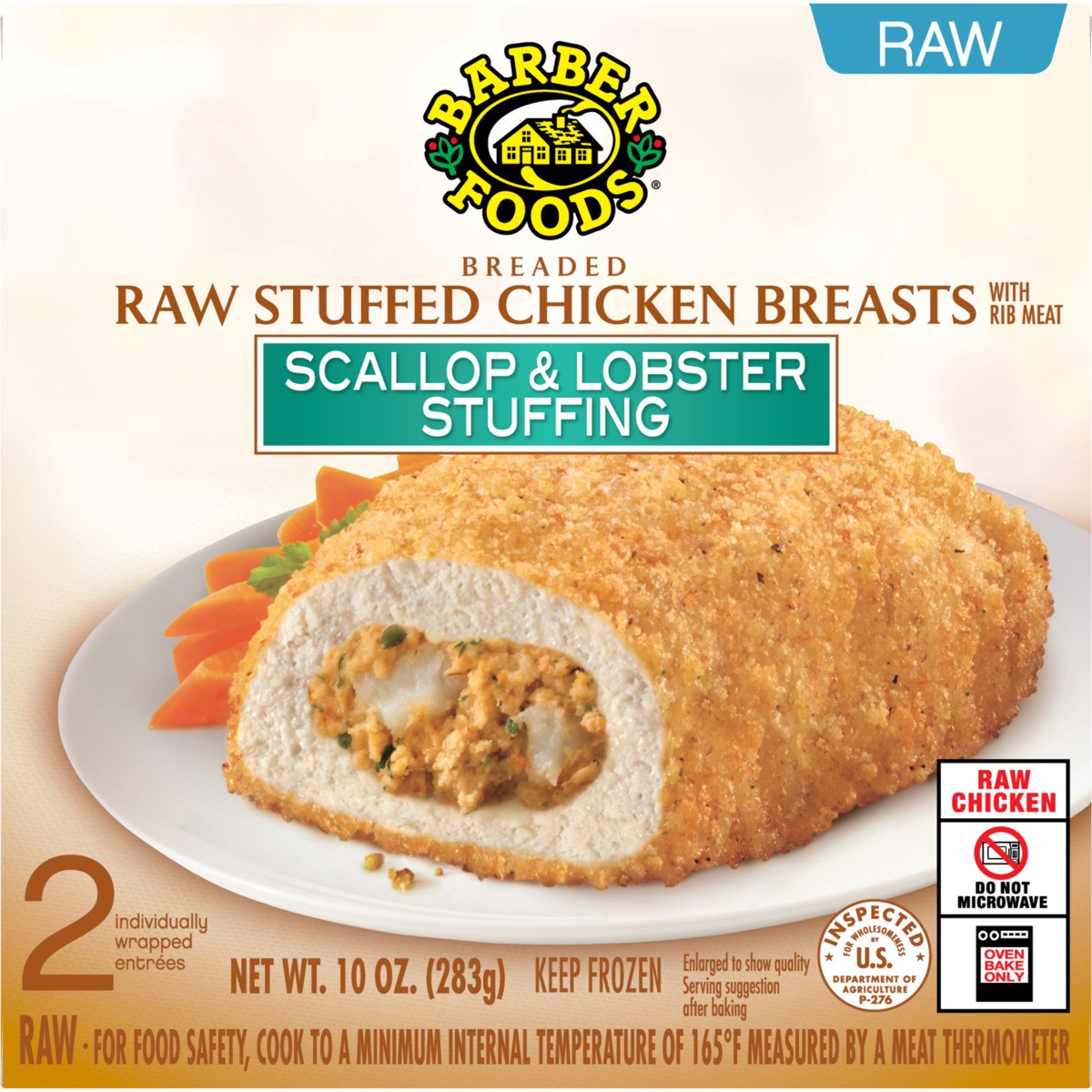 - One 10 oz package of 2 Breaded Raw Stuffed Chicken Breasts Scallop and Lobster
