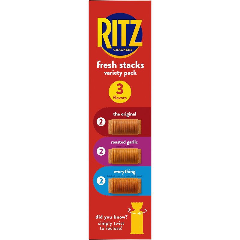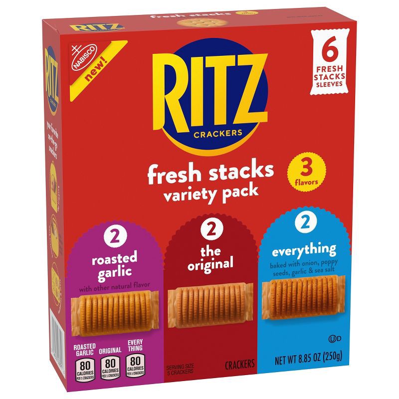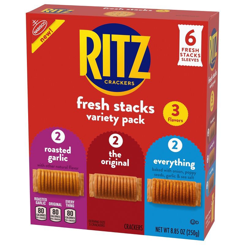 - One 8.85 oz crackers variety pack box with 6 individual cracker stacks of RITZ Fresh Stacks Original, Everything, and Garlic Butter Crackers