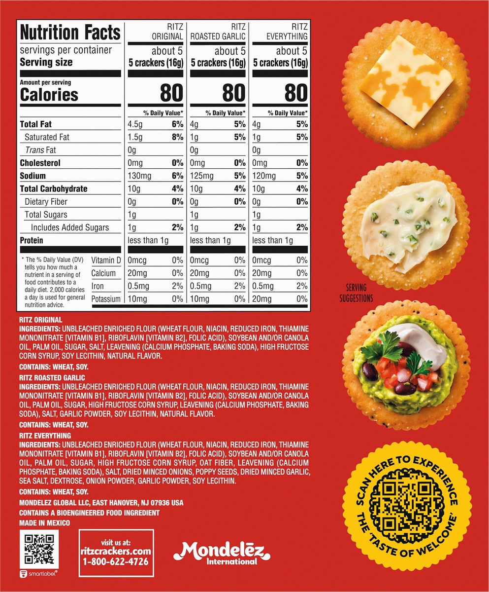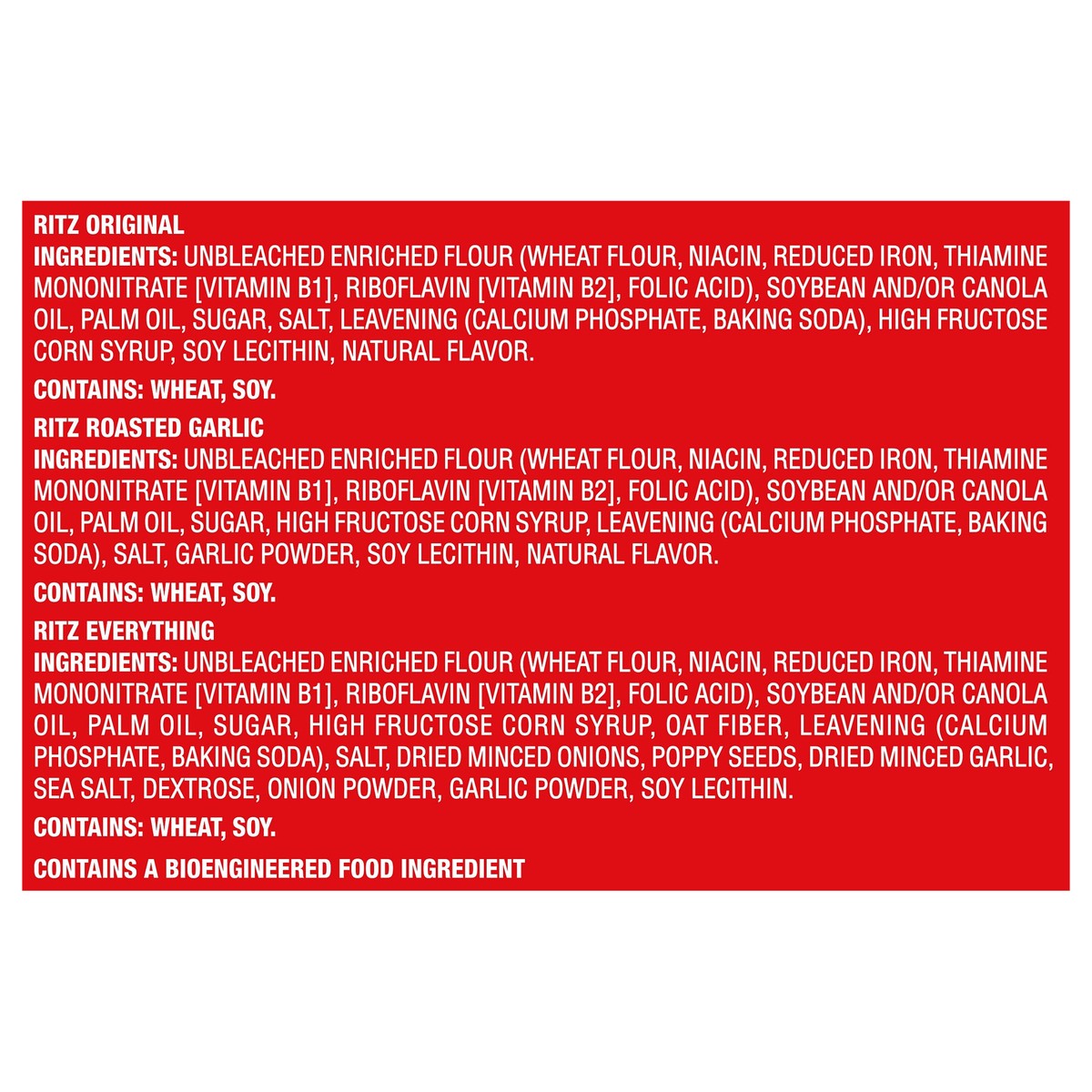 Ritz original: contains: wheat, soy.,ritz roasted garlic: contains: wheat, soy.,ritz everything: contains: wheat, soy.