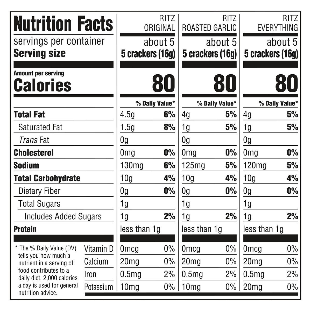 Ritz Original: Unbleached Enriched Flour (Wheat Flour, Niacin, Reduced Iron, Thiamine Mononitrate [Vitamin B1], Riboflavin [Vitamin B2], Folic Acid), Soybean and/or Canola Oil, Palm Oil, Sugar, Salt, …