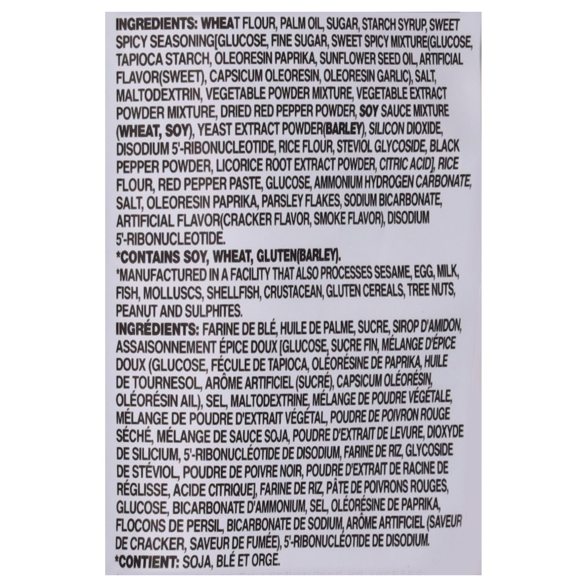 Wheat Flour, Palm Oil, Sugar, Starch Syrup, Sweet Spicy Seasoning[Glucose, Fine Sugar, Sweet Spicy Mixture (Glucose, Tapioca Starch, Oleoresin Paprika, Sunflower Seed Oil, Artificial Flavor (Sweet), C…