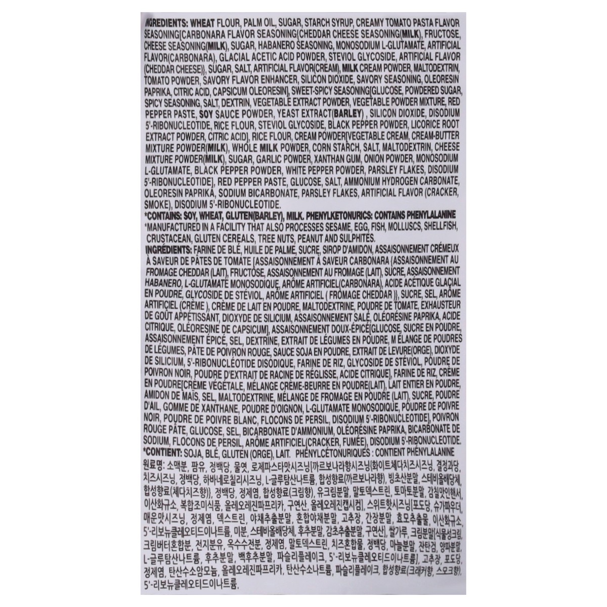 Wheat Flour, Palm Oil, Sugar, Starch Syrup, Creamy Tomato Pasta Flavor Seasoning [Carbonara Flavor Seasoning (Cheddar Cheese Seasoning (Milk), Fructose, Cheese Seasoning(Milk), Sugar, Habanero Seasoni…