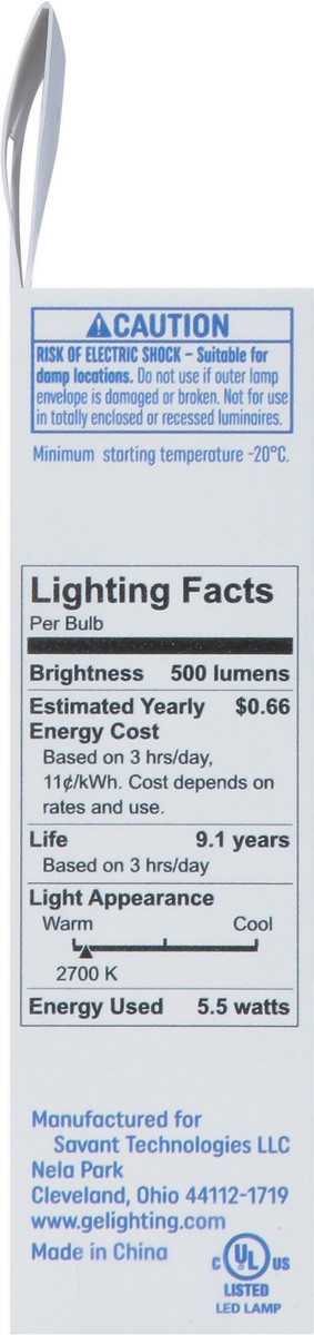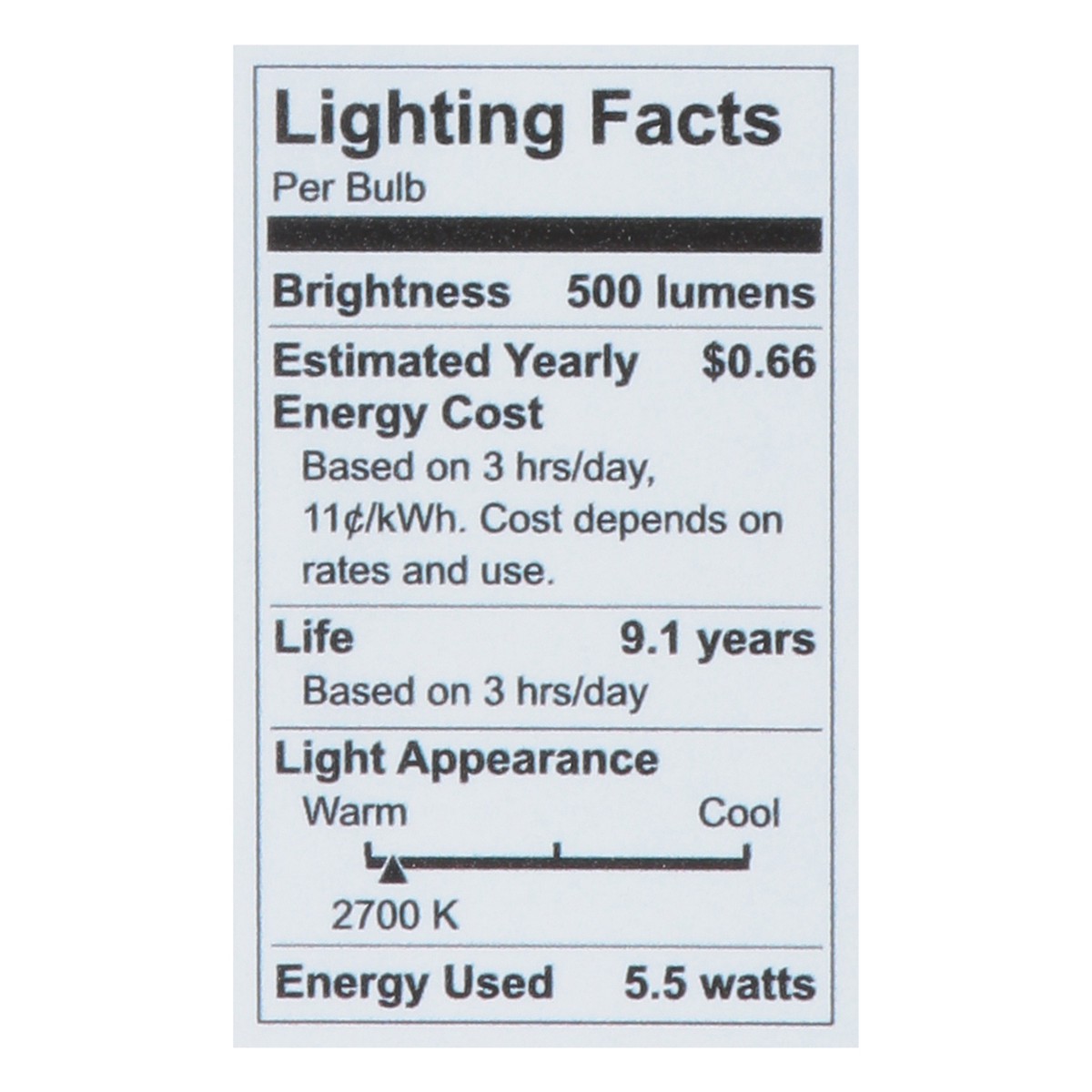 Brightness Quantity: 500 lumens. Energy Info: $0.66 based on 3 hrs/day 11 cents/kWh. Cost depends on rates and use 5.5 watts. Package Info: 2-Pack. 2. Voltage: 120 V. Bulb Info: LED. Is Dimmable. Scre…