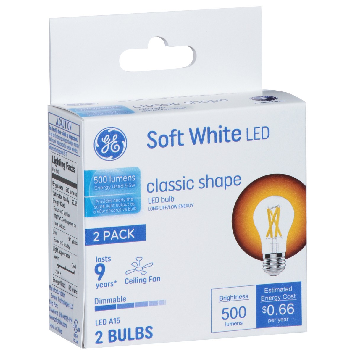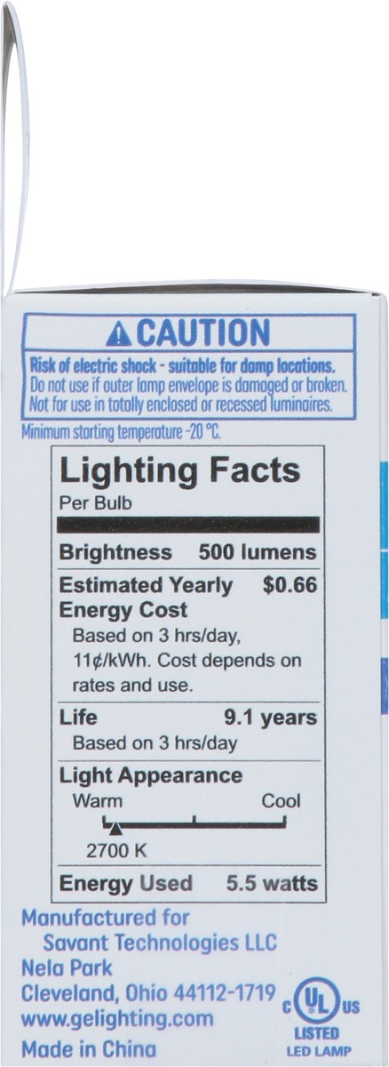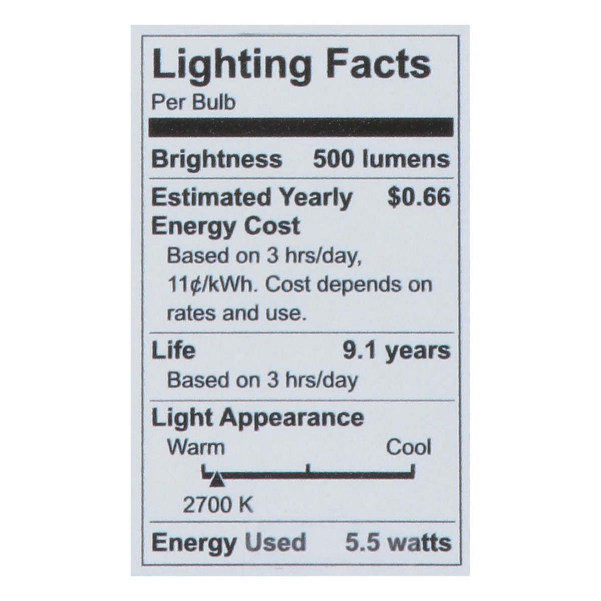 Brightness Quantity: 500 lumens. Energy Info: $0.66 based on 3 hrs/day, 11 ¢/kWh. Cost depends on rates and use. 5.5 watts. Package Info: 2-Pack. 2. Voltage: 120 V. Bulb Info: LED. Is Dimmable. Is Cei…