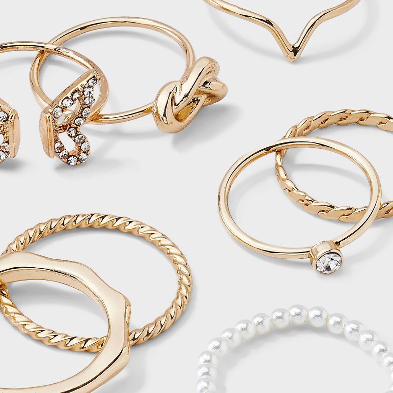 - Pack of 8 stackable rings set in sizes 5, 6, 7