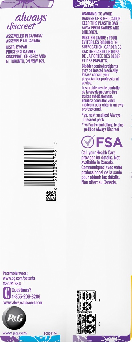 60% more (vs. next smallest Always Discreet pack). Up to 100% protection. RapidDry core. For bladder leaks. Ideal for day or night. Lightly scented. FSA: Call your health care provider for details.