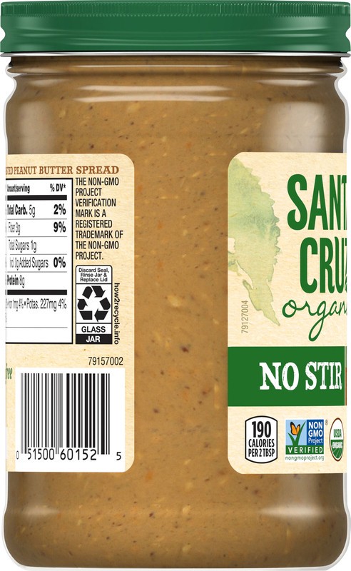 Santa Cruz Organic No Stir Crunchy Dark Roasted Peanut Butter Spread is made from organic peanuts, palm oil, and just a dash of salt. We dark roast our peanuts to create a complex, robust flavor, then…