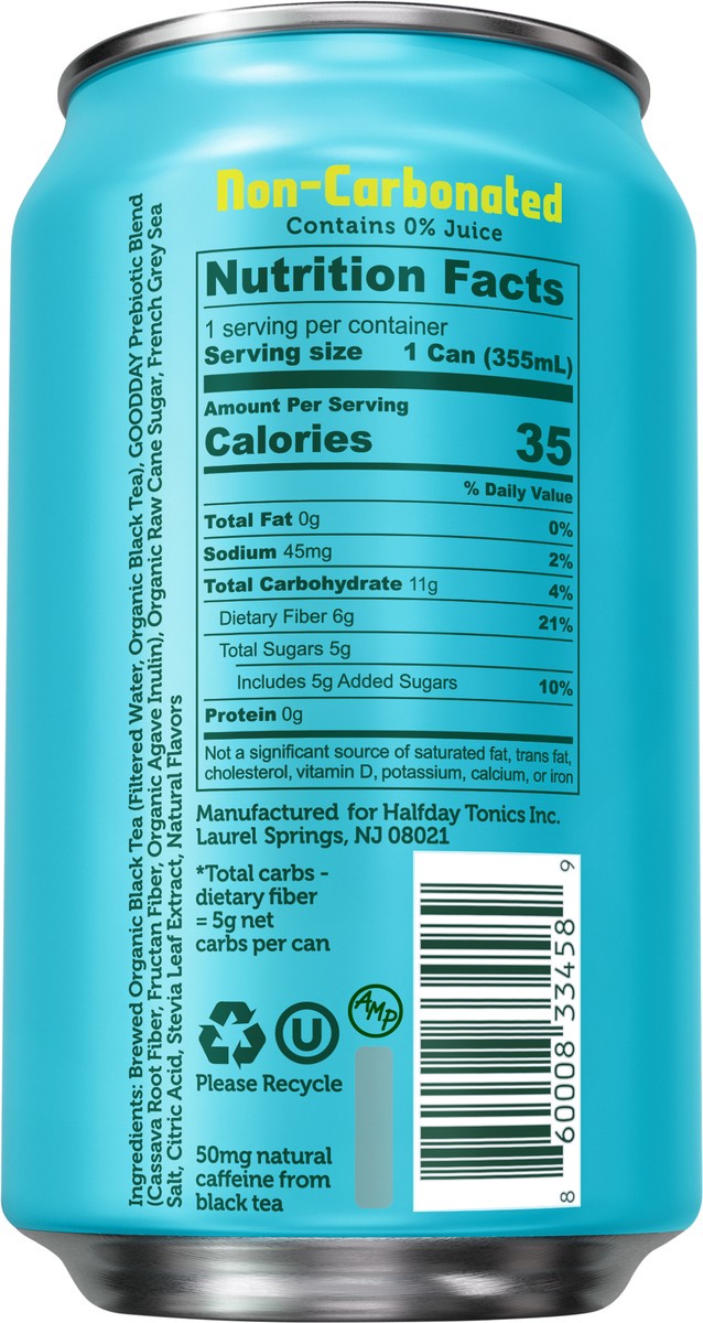 Brewed Organic Black Tea (Filtered Water, Organic Black Tea), Goodday Prebiotic Blend (Cassava Root Fiber, Fructan Fiber, Organic Agave Inulin), Organic Raw Cane Sugar, French Grey Sea Salt, Citric Ac…