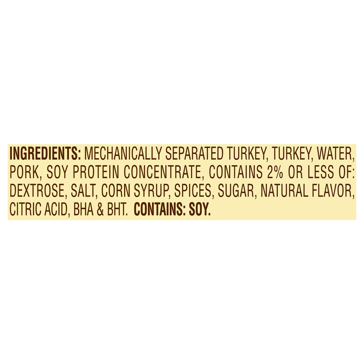 Mechanically Separated Turkey, Turkey, Water, Pork, Soy Protein Concentrate, Contains 2% Or Less Of: Dextrose, Salt, Corn Syrup, Spices, Sugar, Natural Flavor, Citric Acid, BHA & BHT._x000D_ CONTA…