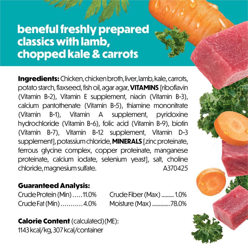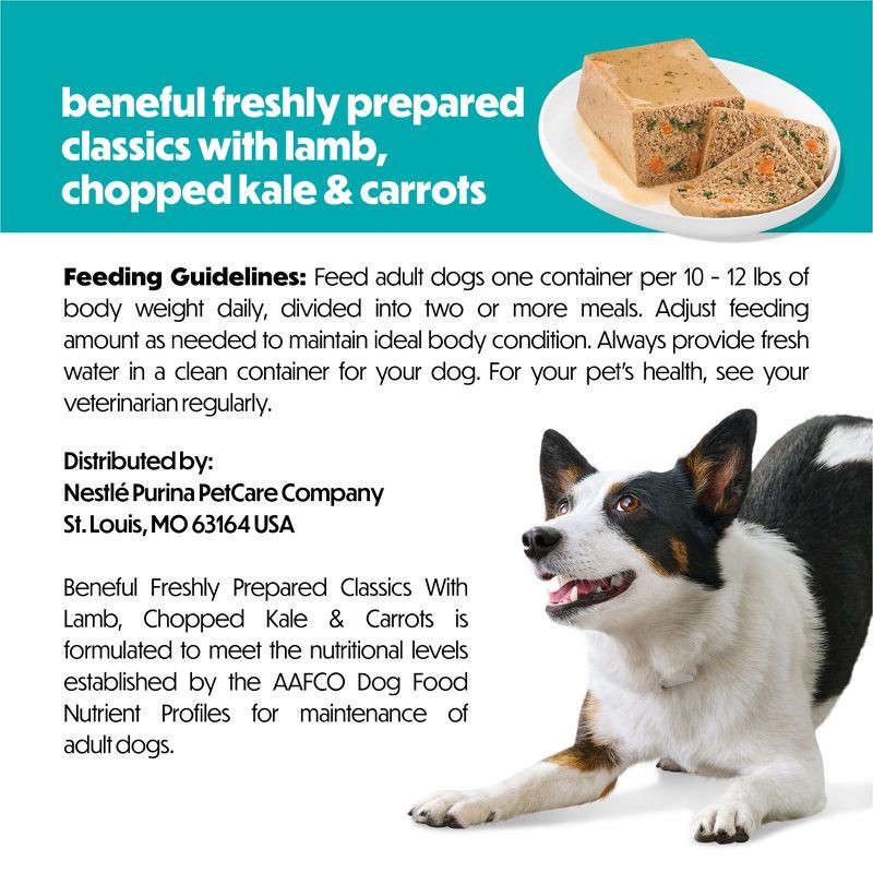 - Made with Lamb Dog Food: Purina Beneful Freshly Prepared Classics With Lamb, Chopped Kale and Carrots adult dog food is made fresh with quality ingredients and steam cooked to lock in flavor.