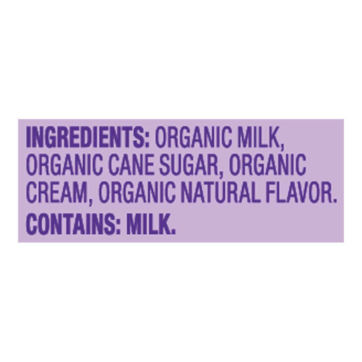 ORGANIC MILK, ORGANIC CANE SUGAR, ORGANIC CREAM, ORGANIC NATURAL FLAVOR.