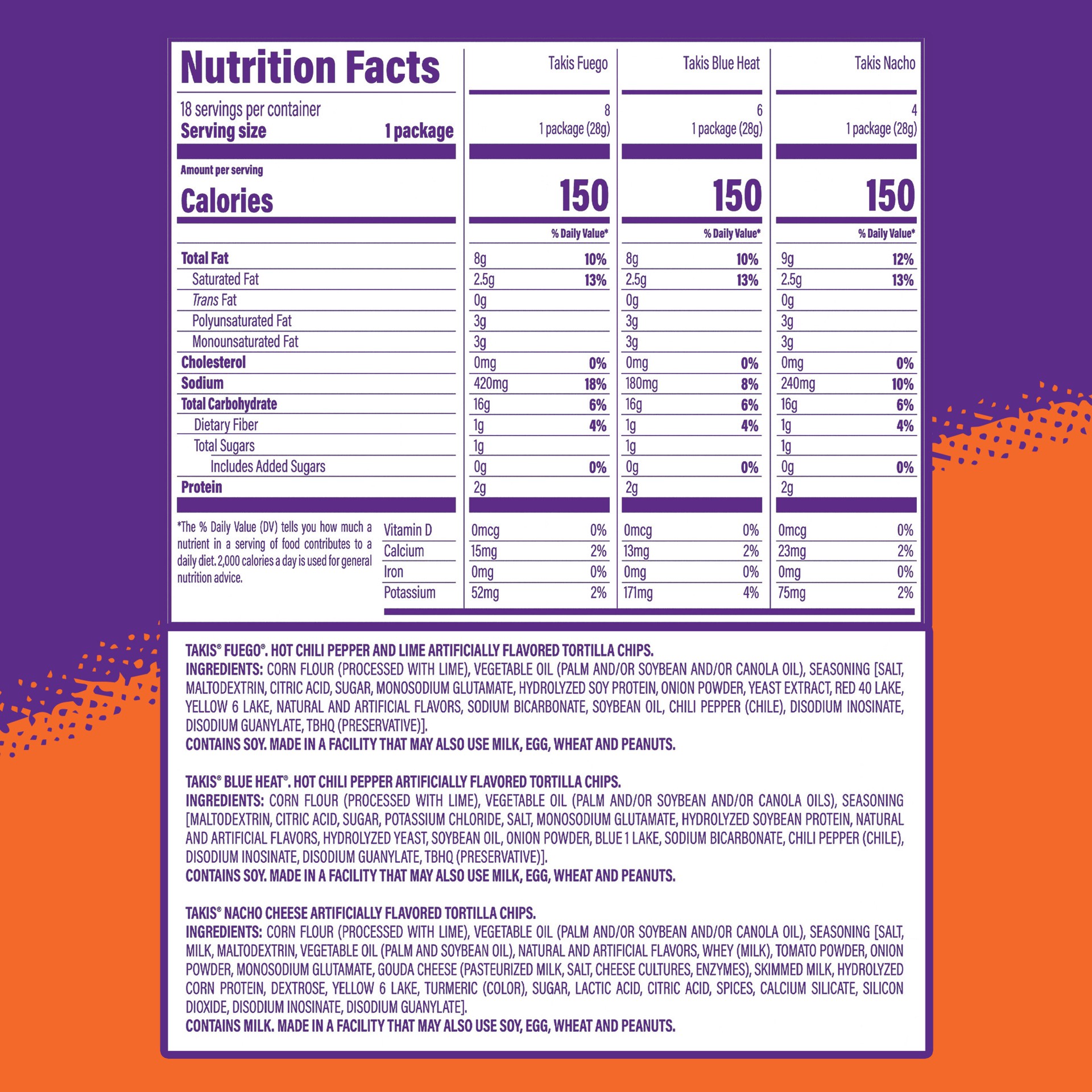 Takis Fuego, Hot Chili Pepper And Lime Artificially Flavored Tortilla Chips: [Corn Flour (Processed With Lime), Vegetable Oil (Palm And/Or Soybean And/Or Canola Oil), Seasoning [Salt, Maltodextrin, Ci…