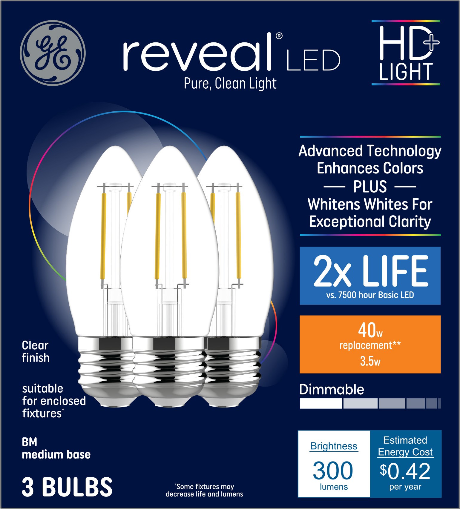 GE Reveal HD 40 -Watt EQ B11 Color-enhancing Medium screw base E26 Dimmable LED Decorative Light Bulb 3 -Pack