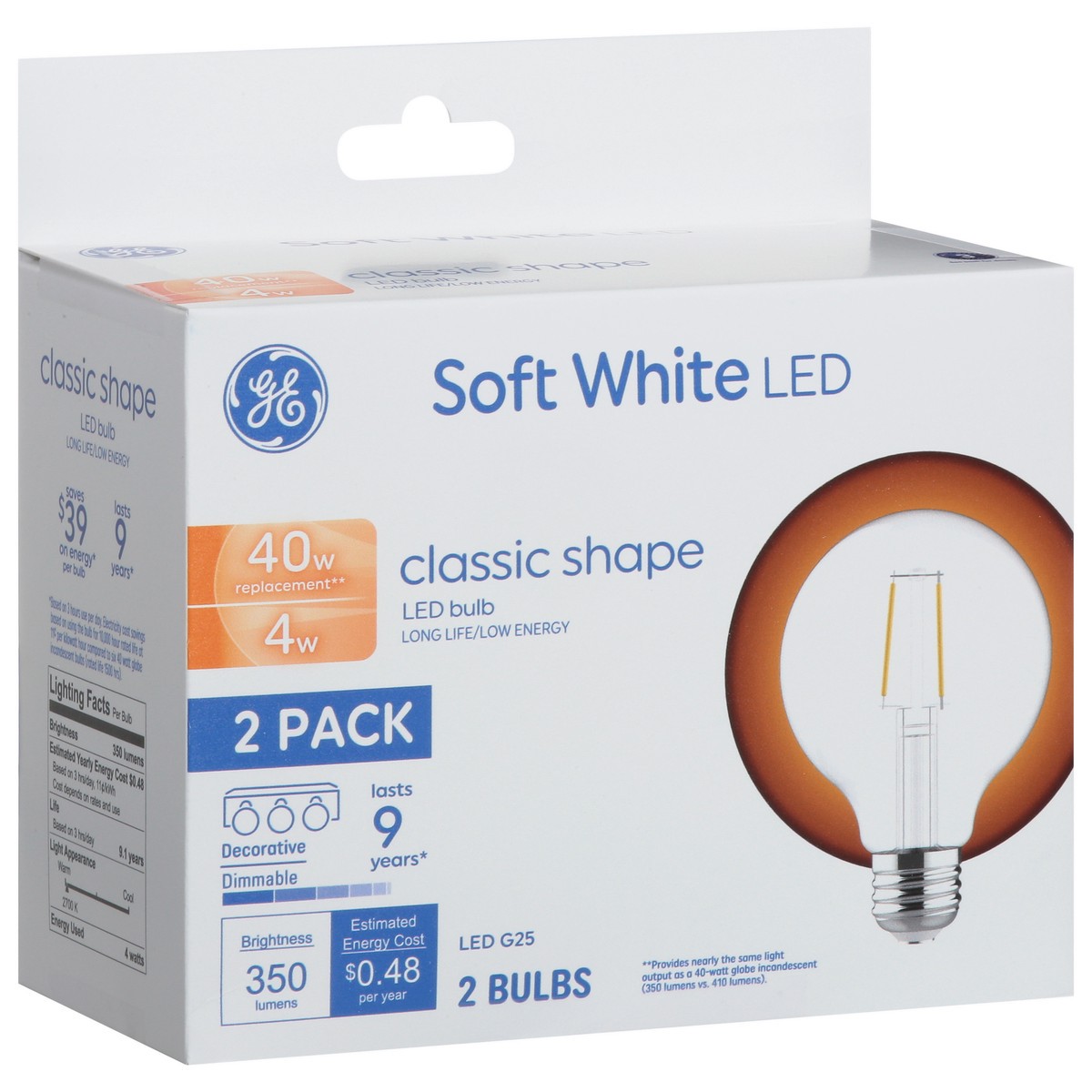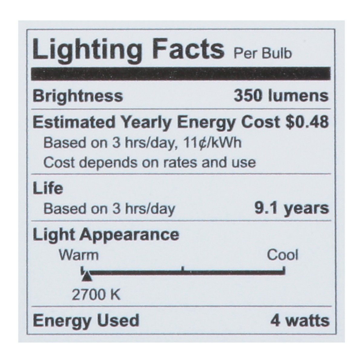 Brightness Quantity: 350 lumens. Energy Info: $0.48 based on 3 hrs/day, 11 cent/kWh. Cost depends on rates and use. 4 watts. Package Info: 2-Pack. 2. Bulb Info: Screw. Bulb Life: 9.1 years based on 3 …