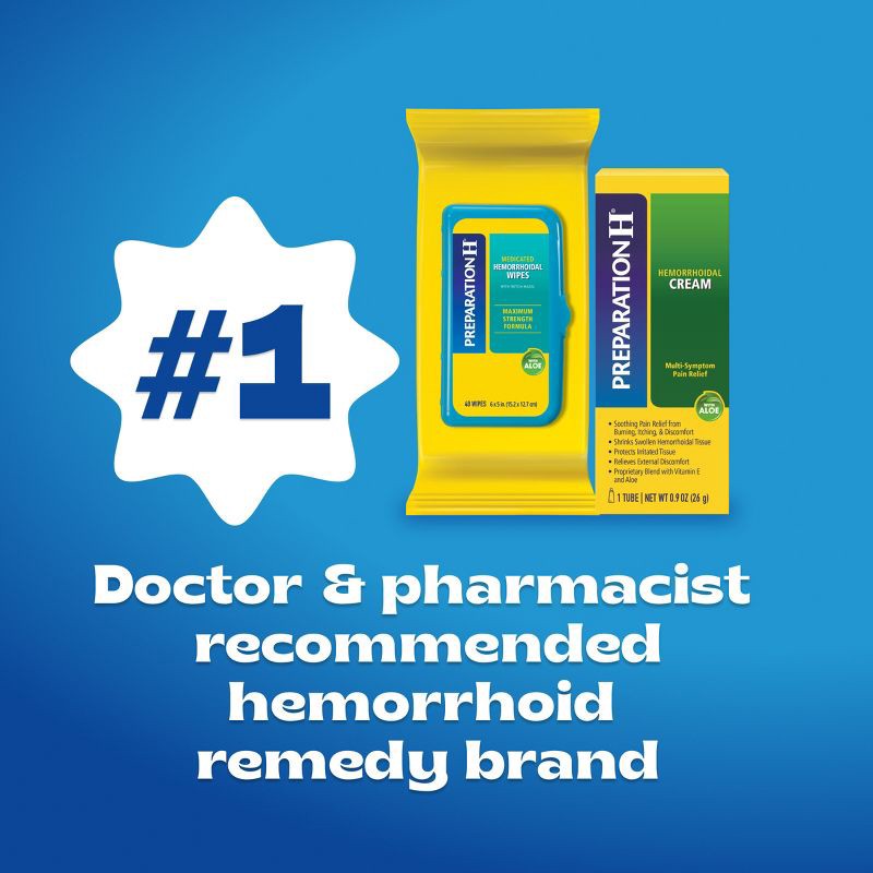 - Box of 48 Preparation H Hemorrhoid Wipes with Witch Hazel for gentle, everyday cleansingHemorrhoid treatment delivers relief of irritation caused by hemorrhoids while cleansing the areaMedicated wipes formulated with soothing aloe and cleansing witch hazelFlushable wipes help temporarily relieve skin irritation associated with hemorrhoidsPreparation H medicated wipes are biodegradable and septic safeHSA and FSA eligible item. Medicare Advantage OTC (MAOTC) eligible. *OTC benefits and eligible products vary by plan. Check your plan for specific details.Preparation H Medicated Wipes can be used before topical treatments such as Preparation H Ointment, Cream, Gel or Suppositories