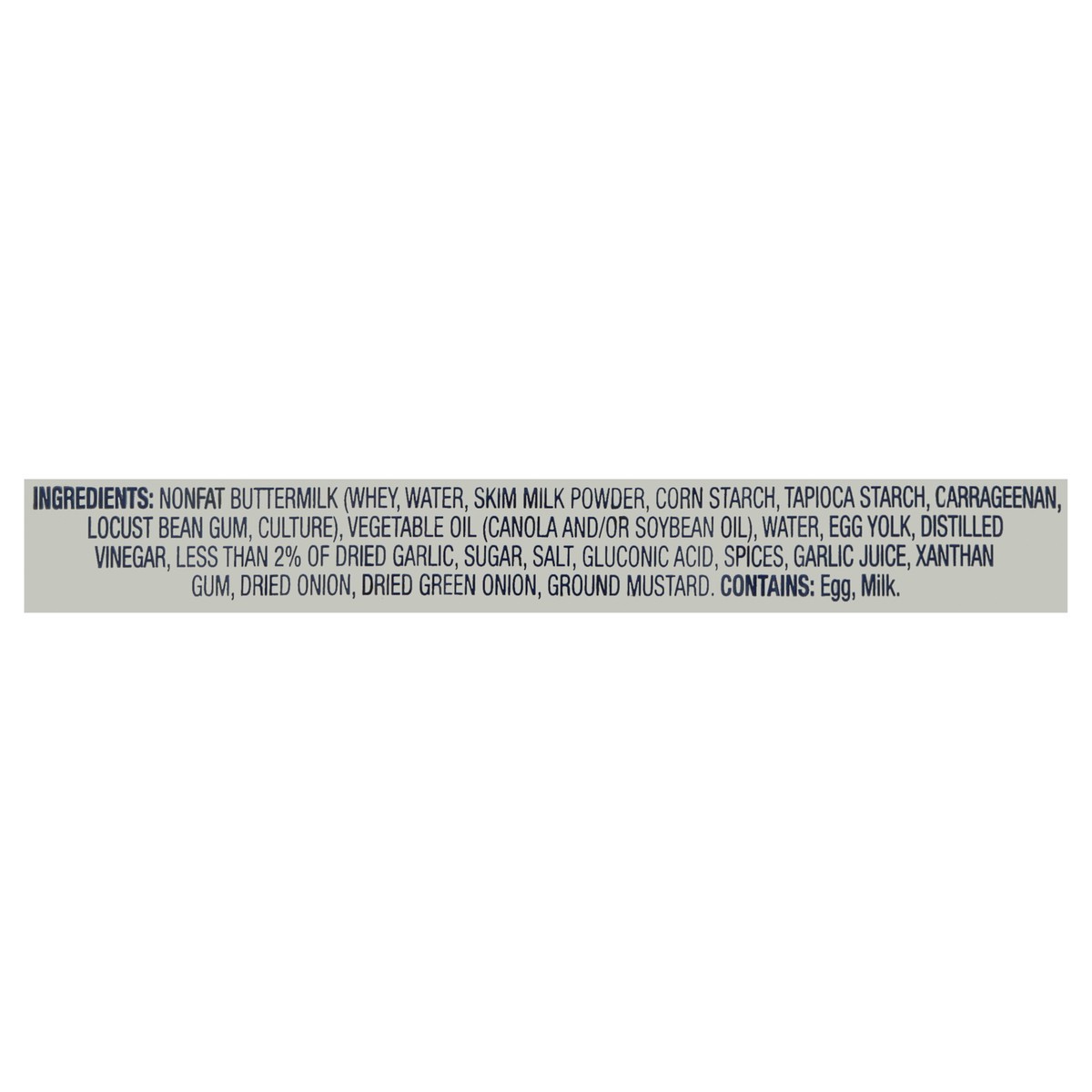 Nonfat Buttermilk (Whey, Water, Skim Milk Powder, Corn Starch, Tapioca Starch, Carrageenan, Locust Bean Gum, Culture), Vegetable Oil (Canola and/or Soybean Oil), Water, Egg Yolk, Distilled Vinegar, Le…