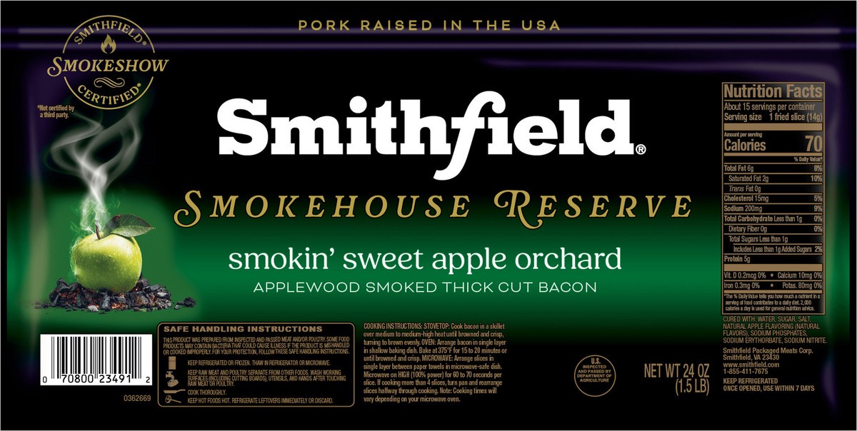 Apple smoked thick cut bacon. U.S. inspected and passed by Department of Agriculture. Smithfield Smokeshow Certified*. * Not certified by a third party. www.smithfield.com. Pork raised in the USA.
