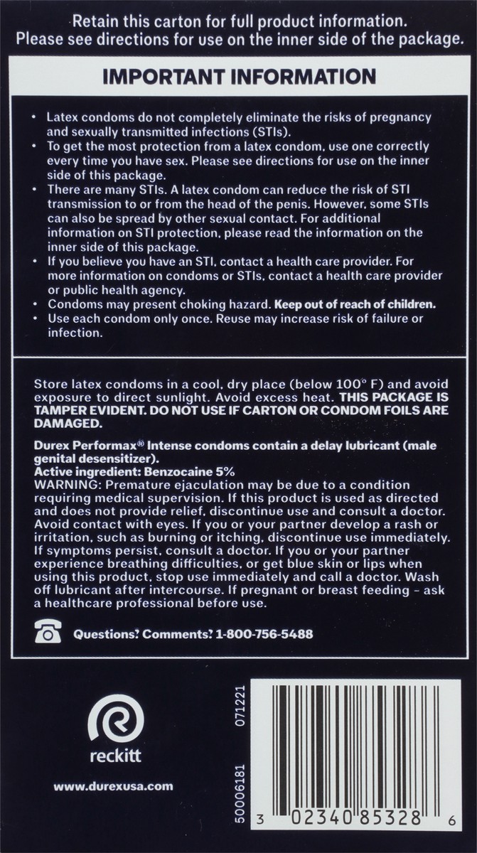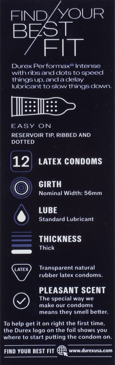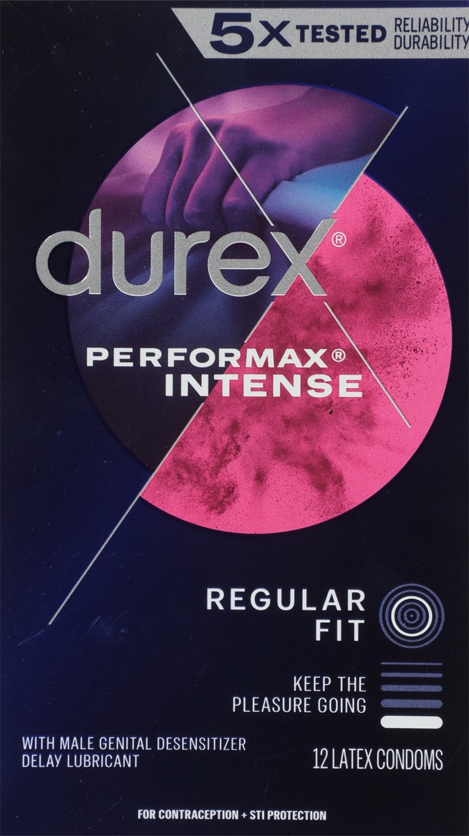 Durex Performax Intense Condoms are delay condoms for men are made with a desensitizing lubricant to help him last longer and are textured and designed to help speed her up. Condoms contain climax con…