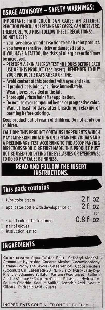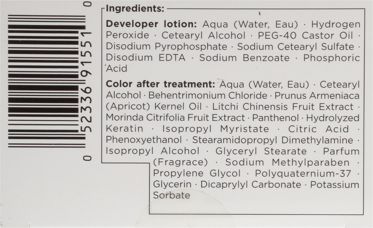 Color Cream: Aqua (Water), Cetearyl Alcohol, Ammonium Hydroxide, Coconut Alcohol, Cocamidopropyl Betaine, Propylene Glycol, Ceteareth-50, Cocos Nucifera (Coconut) Oil, Ceteareth-20, N,N-Bis(2-Hydroxye…