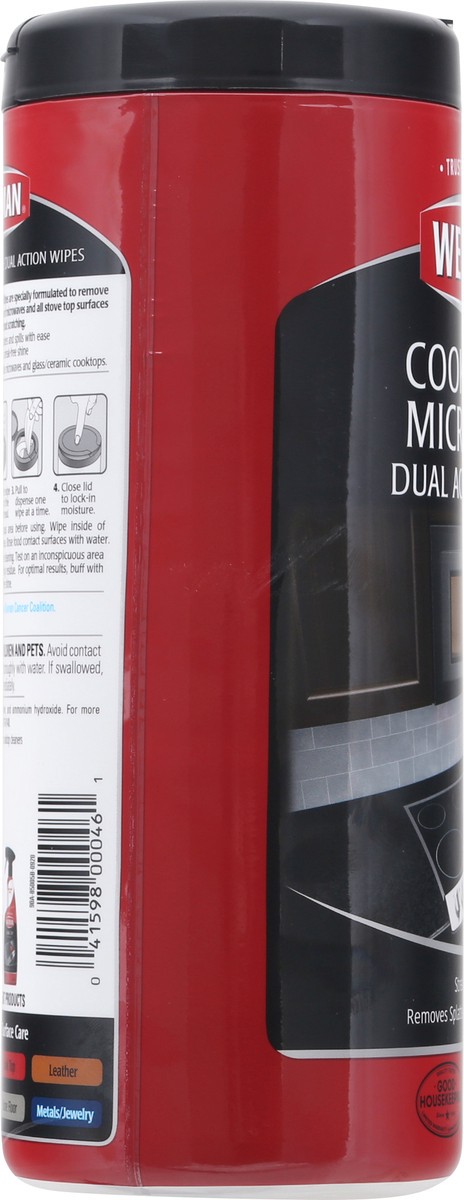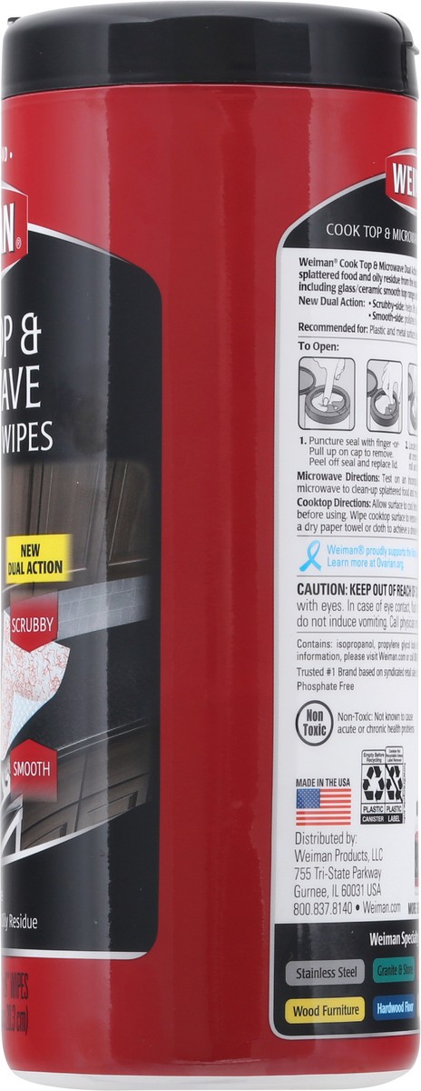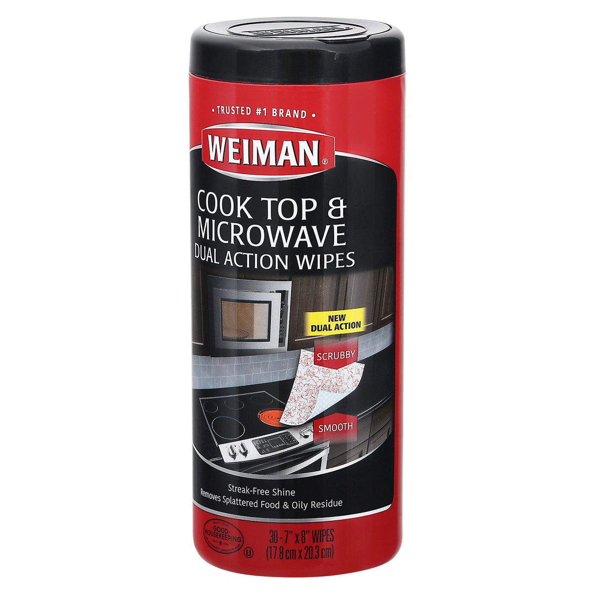 7 inch x 8 inch wipes (17.8 cm x 20.3 cm). Trusted No 1 brand. New dual action. Scrubby, Smooth. Streak-free shine removes splattered food & oily residue. Weiman cook top & microwave dual action Wipes…