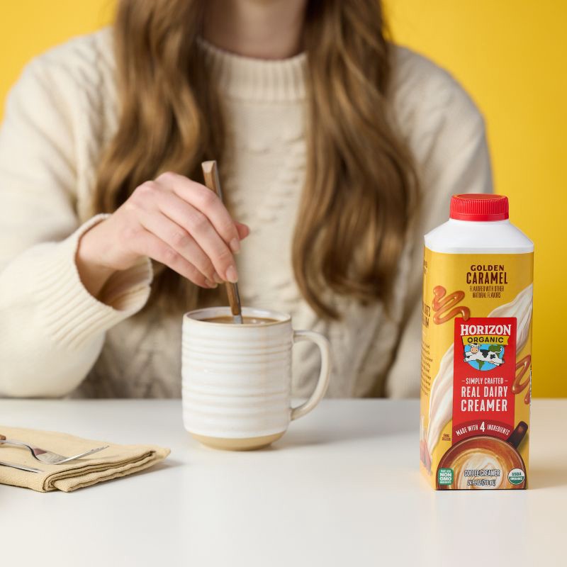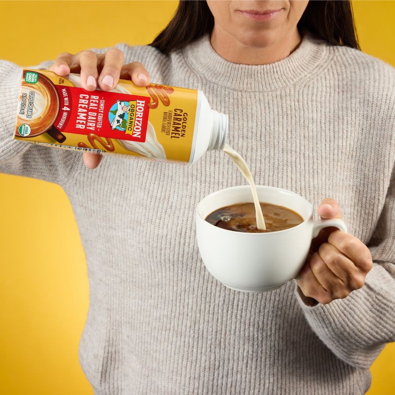 - DELICIOUSLY CREAMY: One 24 fl oz carton of Horizon Organic Real Dairy Golden Caramel Coffee Creamer adds flavor to your coffee beverages