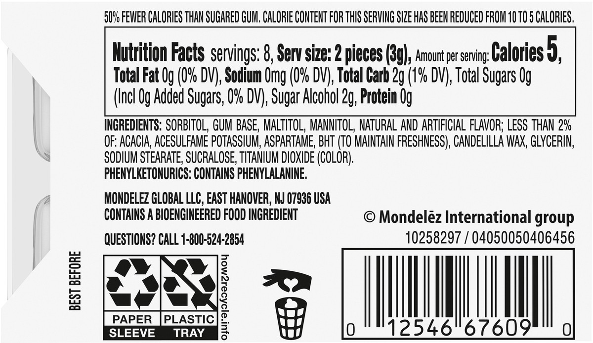 Sorbitol, Gum Base, Maltitol, Mannitol, Natural and Artificial Flavoring; Less than 2% of: Acacia, Acesulfame Potassium, Aspartame, BHT (to Maintain Freshness), Candelilla Wax, Glycerin, Sodium Steara…
