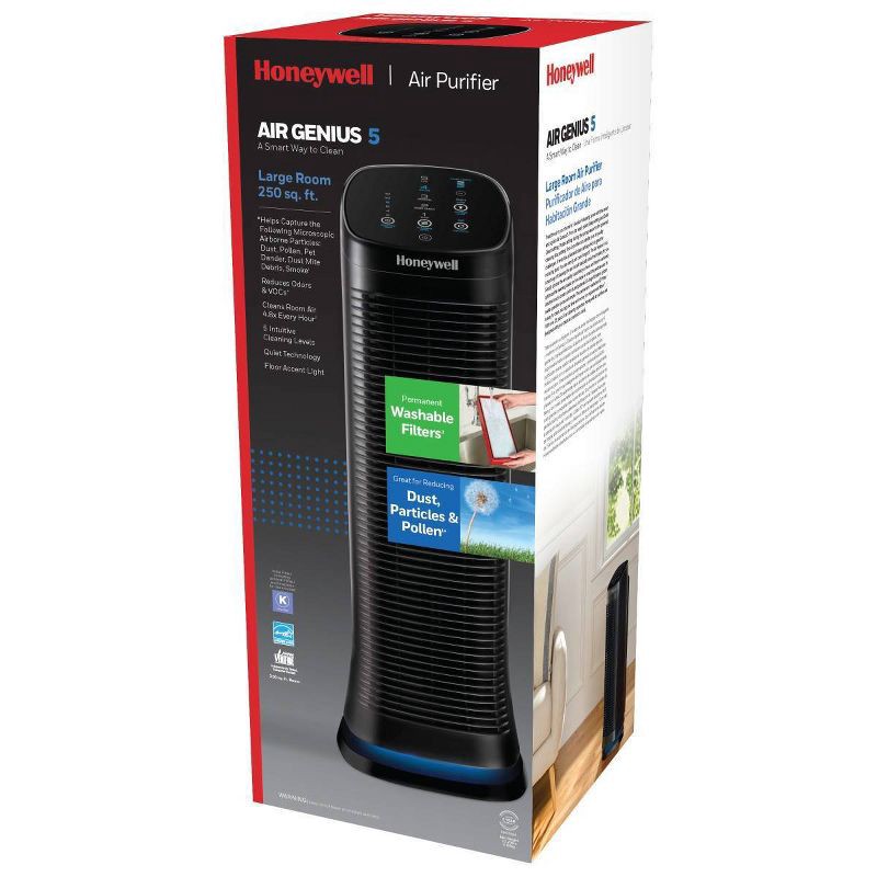 This Honeywell Air Genius 5 Air Purifier features 5 levels of cleaning power and patented ifD® technology to capture up to 99.9% of microscopic airborne particles.¹¹From the air that passes through th…