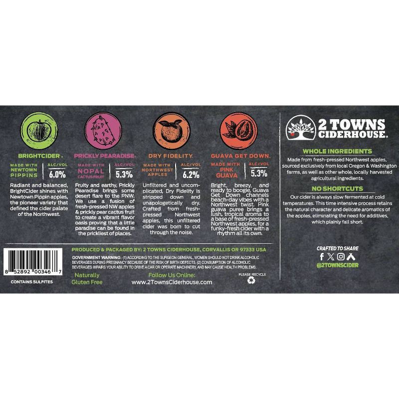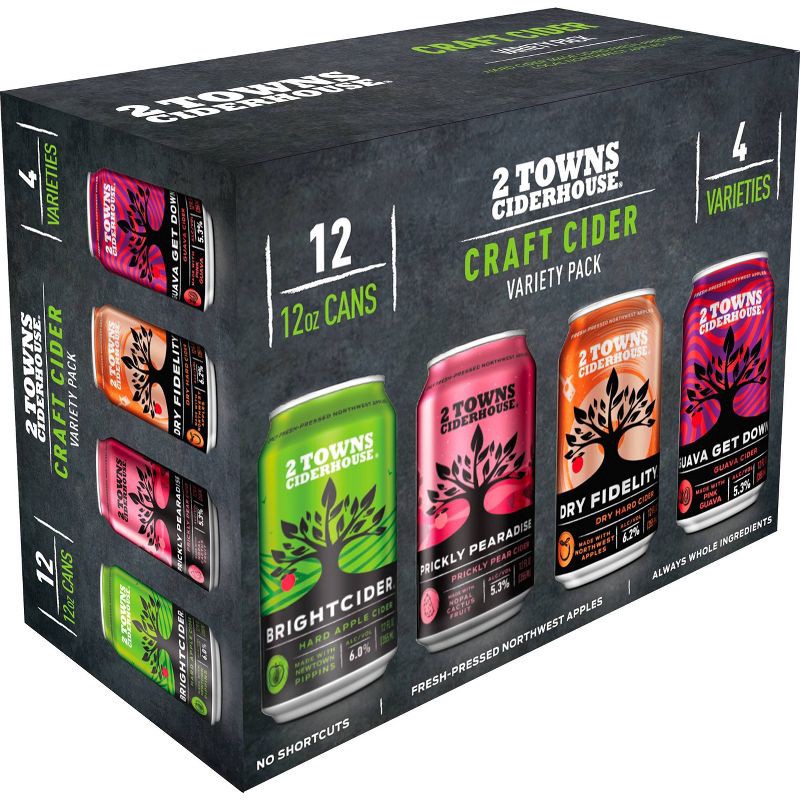 - 2 Towns Craft Cider Variety 12-Pack includes BrightCider, Prickly Pearadise, Guava Get Down and Dry Fidelity.