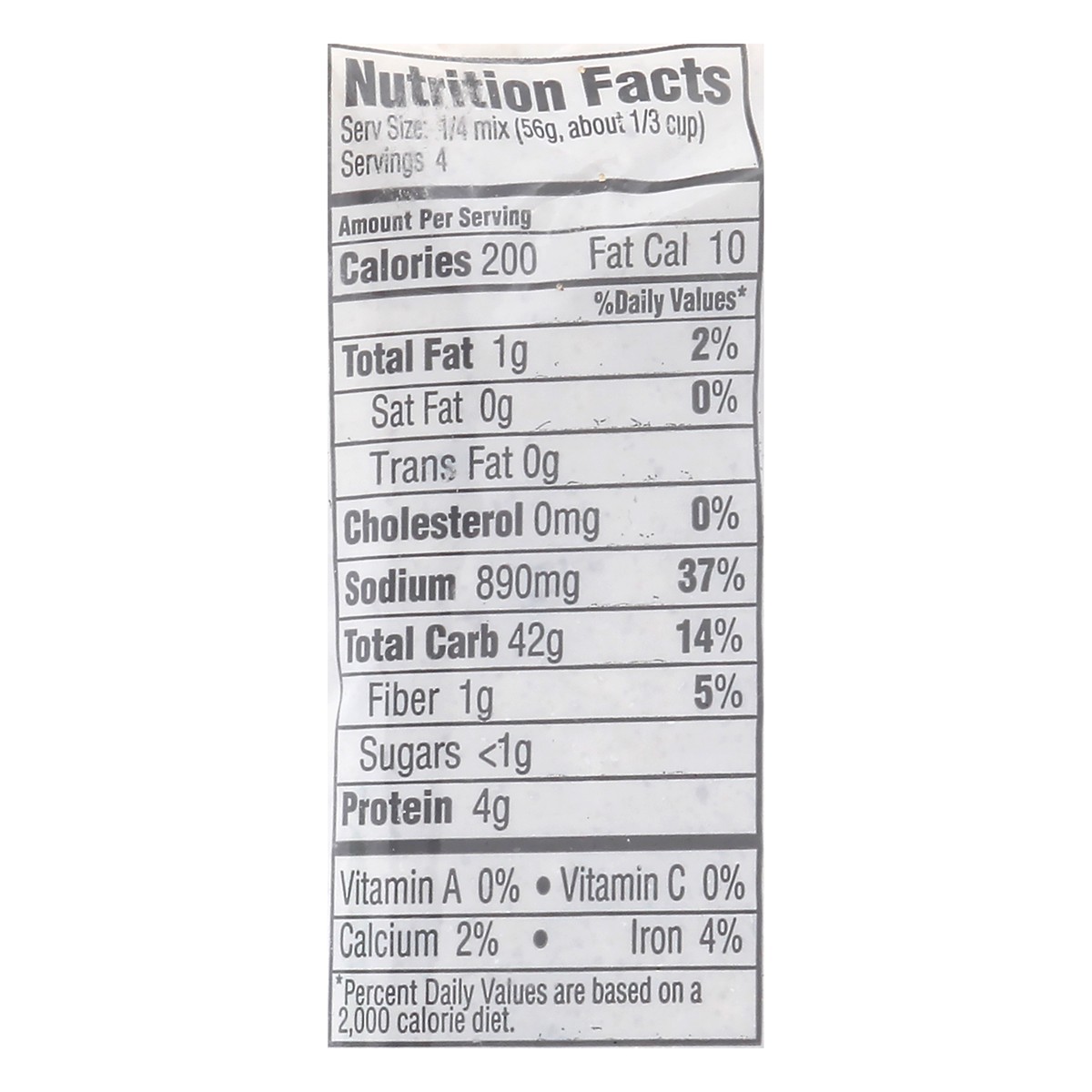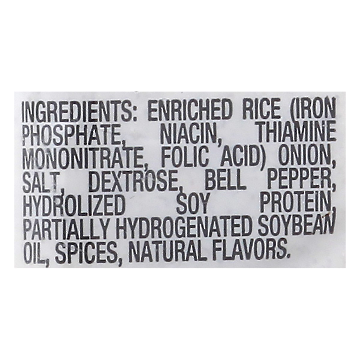 Enriched Rice (Iron Phosphate, Niacin, Thiamine Mononitrate, Folic Acid) Onion, Salt, Dextrose, Bell Pepper, Hydrolized Soy Protein, Partially Hydrogenated Soybean Oil, Spices, Natural Flavors.
