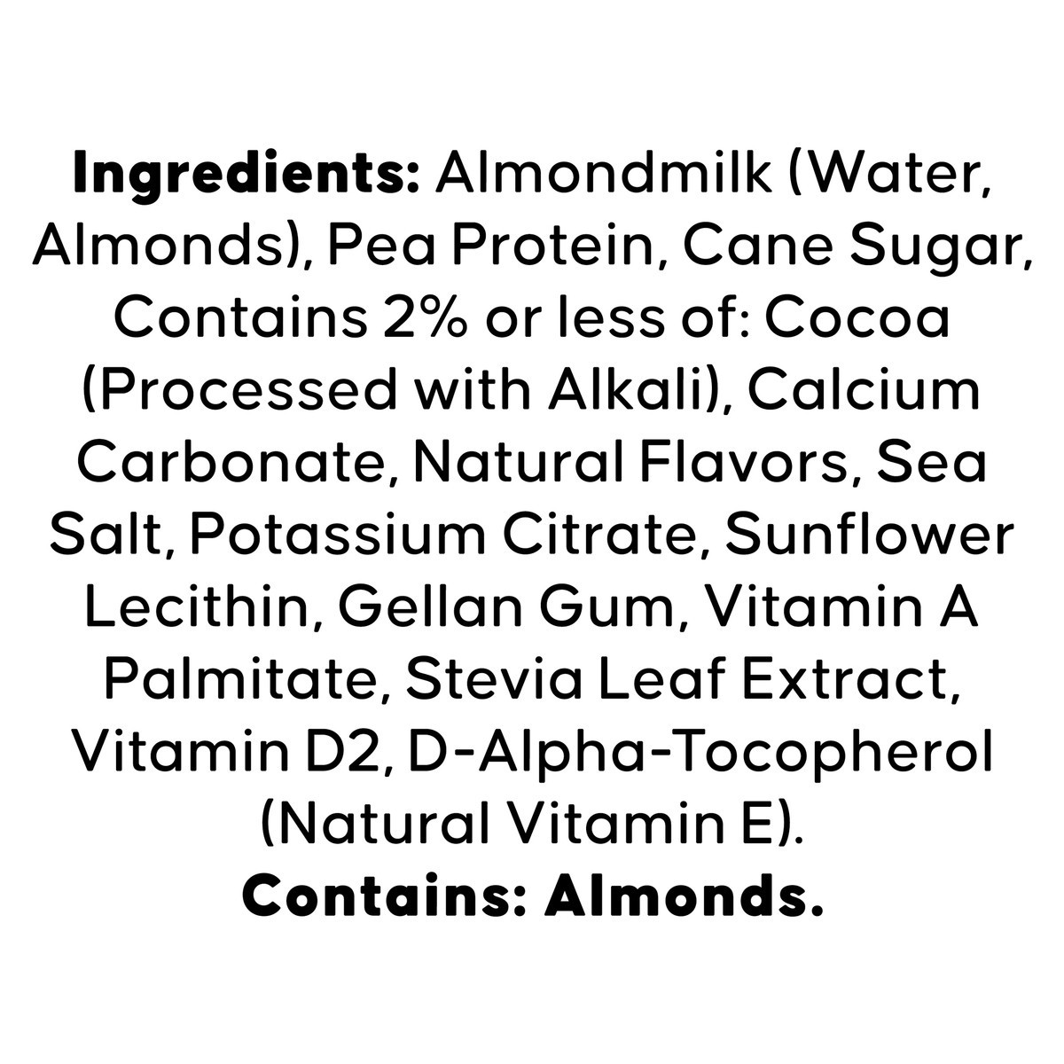 Almondmilk (Water, Almonds), Pea Protein, Cane Sugar, Contains 2% or Less of: Cocoa (Processed with Alkali), Calcium Carbonate, Natural Flavors, Sea Salt, Potassium Citrate, Sunflower Lecithin, Gellan…