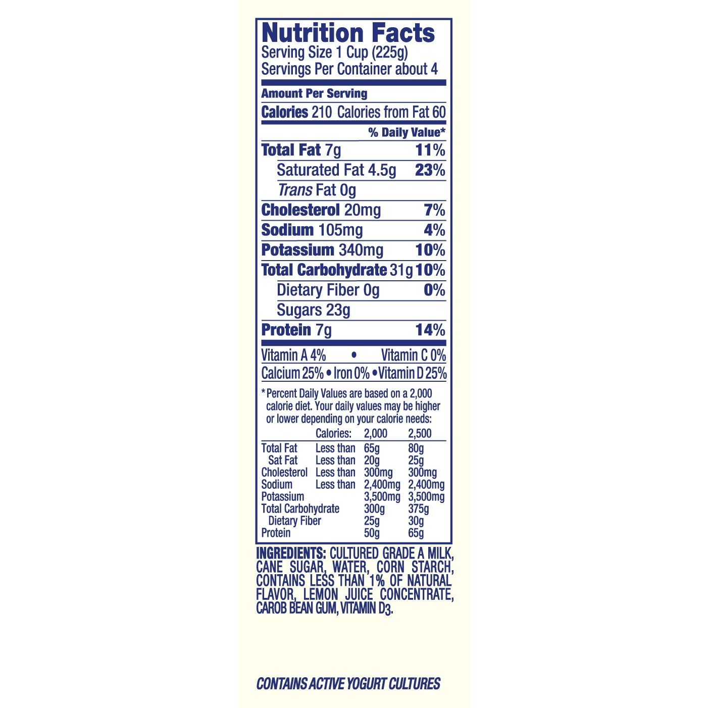 Cultured Grade A Milk, Water, Cane Sugar, Food Starch, Contains Less than 1% of Natural Flavors, Lemon Juice Concentrate, Carob Bean Gum, Milk Calcium, Vitamin D3, Live & Active Yogurt Cultures S. The…