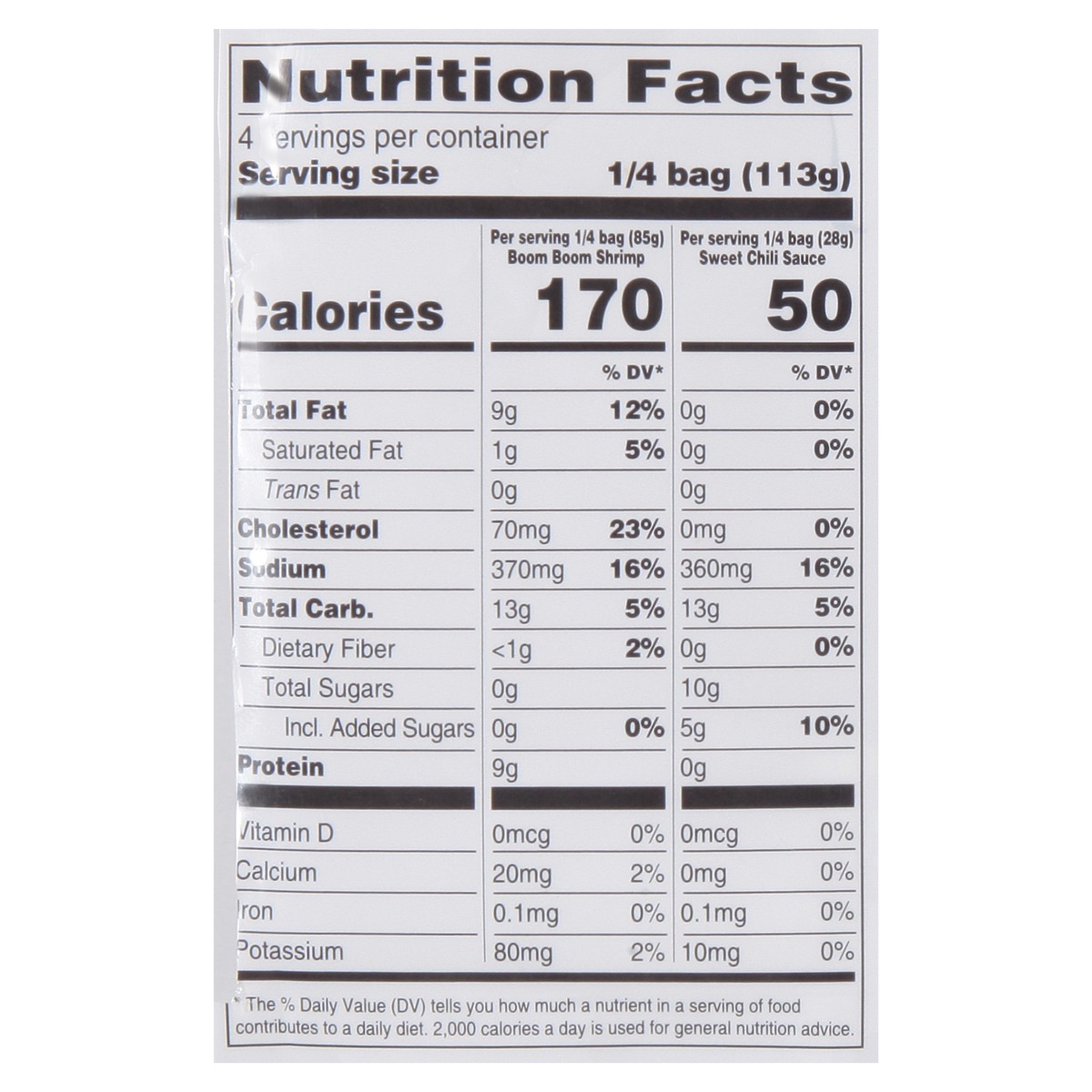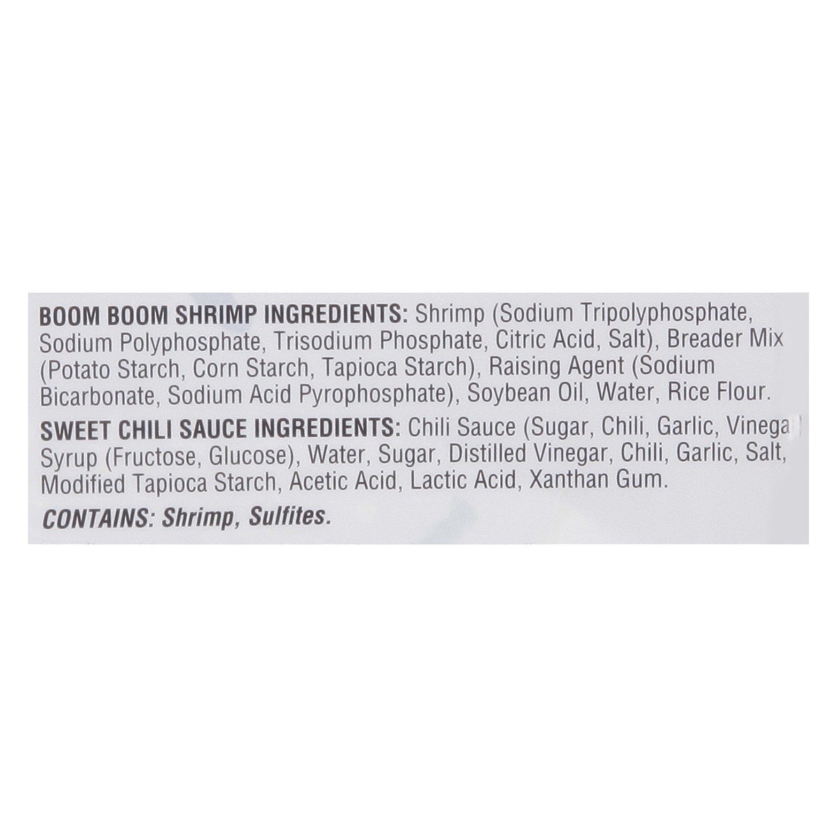 Boom Boom Shrimp Ingredients: Shrimp (Sodium Tripolyphosphate, Sodium Polyphosphate, Trisodium Phosphate, Citric Acid, Salt), Breader Mix (Potato Starch, Corn Starch, Tapioca Starch), Raising Agent (S…