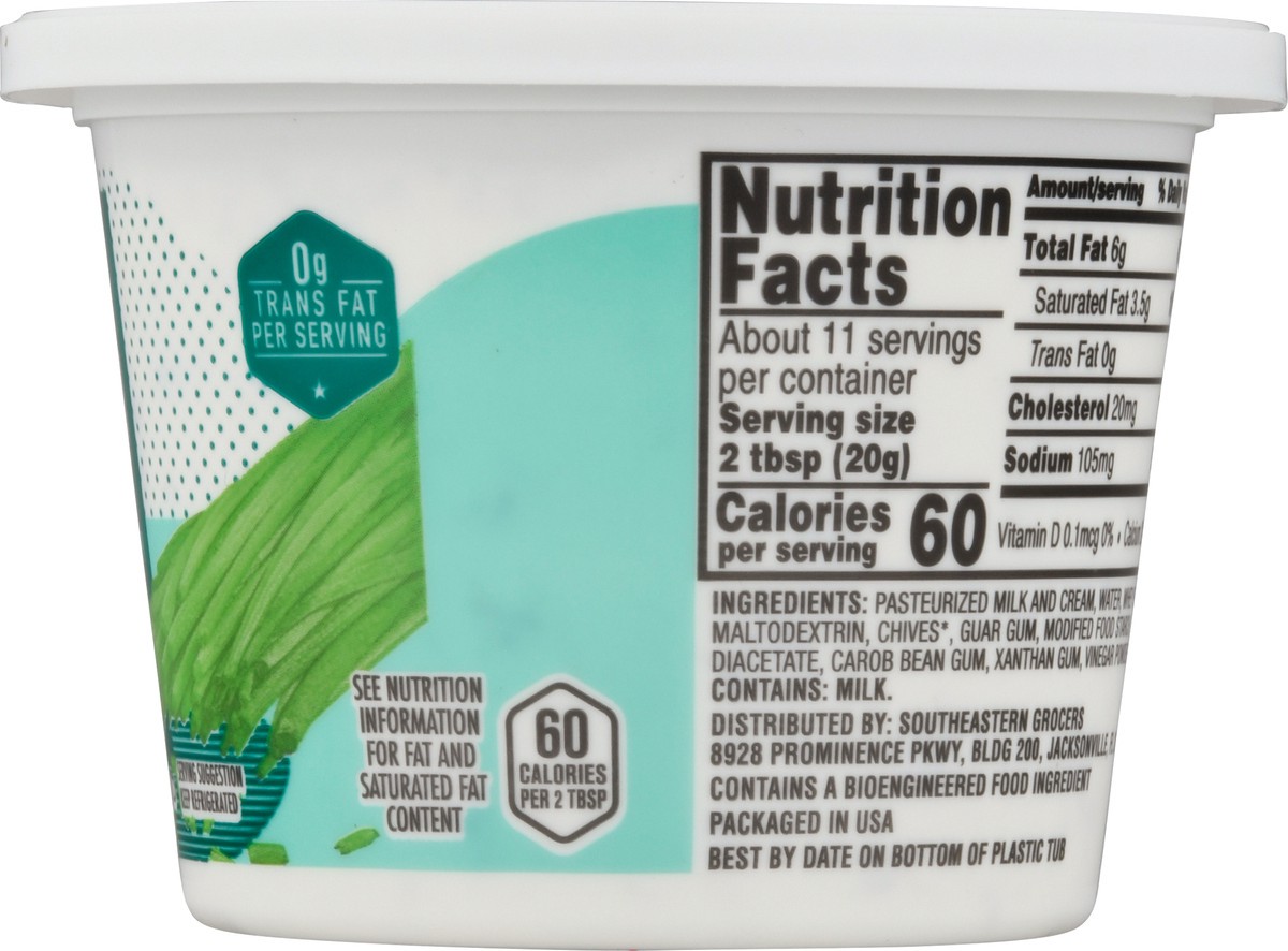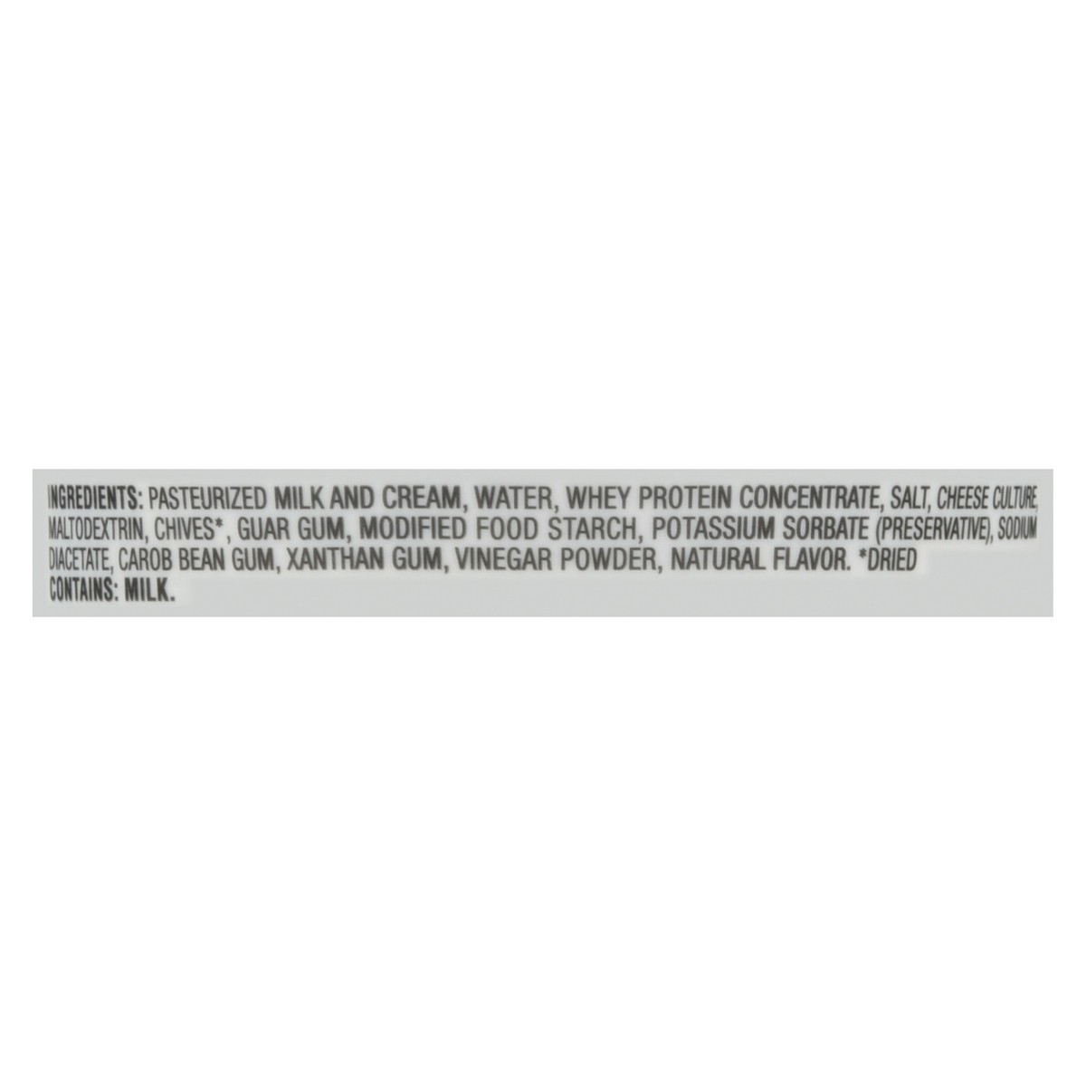 Pasteurized Milk and Cream, Water, Whey Protein Concentrate, Salt, Cheese Culture, Maltodextrin, Chives (Dried), Guar Gum, Modified Food Starch, Potassium Sorbate (Preservative), Sodium Diacetate, Car…