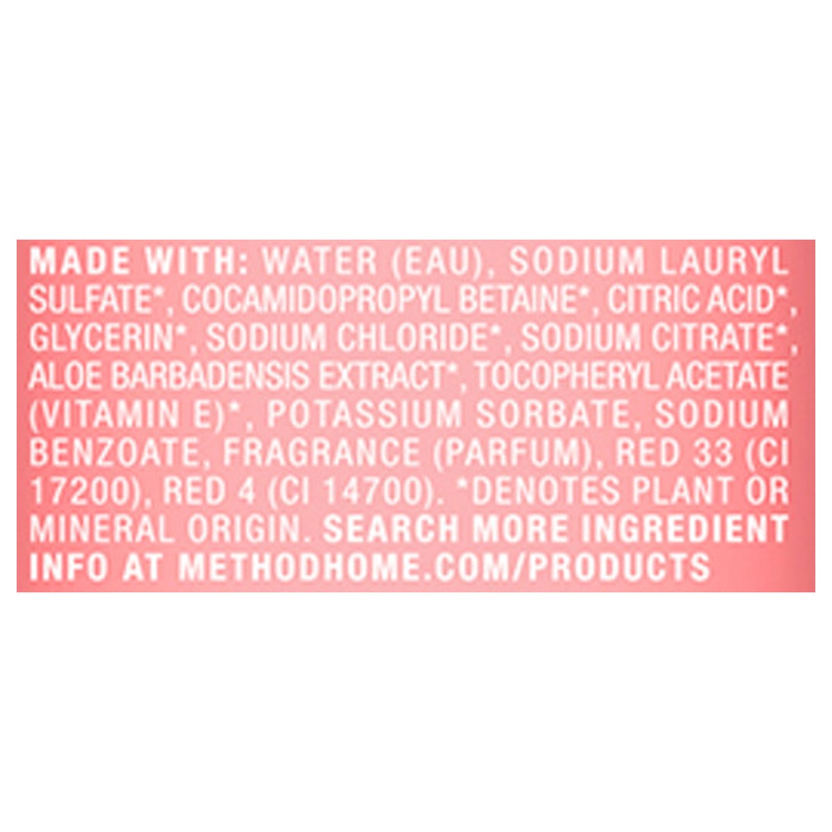 Made with: Water (Eau), Sodium Lauryl Sulfate*, Cocamidopropyl Betaine*, Citric Acid*, Glycerin*, Sodium Chloride*, Sodium Citrate*, Aloe Barbadensis Extract*, Tocopheryl Acetate (Vitamin E)*, Potassi…