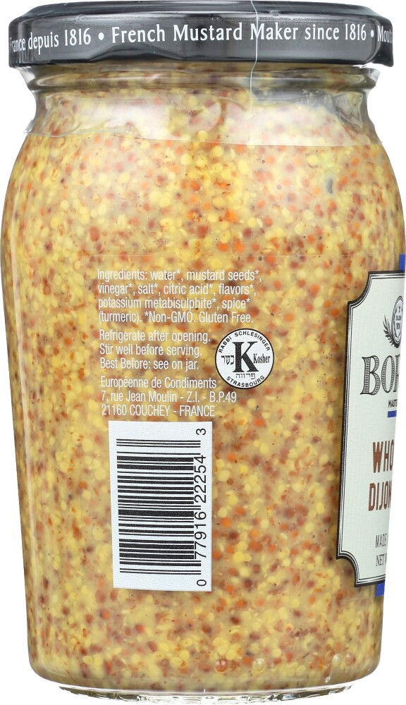Gluten free. Non-GMO. Bornier - Master mustard maker. Dijon 1816. French mustard maker since 1816. Gold Medal: National mustard museum World-wide mustard competition. Made in Dijon Region, France.
