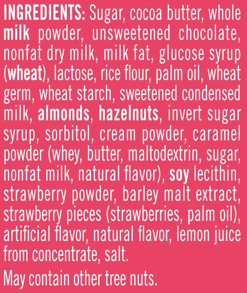 Ingredients: Sugar, cocoa butter, whole milk powder, unsweetened chocolate, nonfat dry milk, milk fat, glucose syrup (wheat), lactose, rice flour, palm oil, wheat germ, wheat starch, sweetened condens…