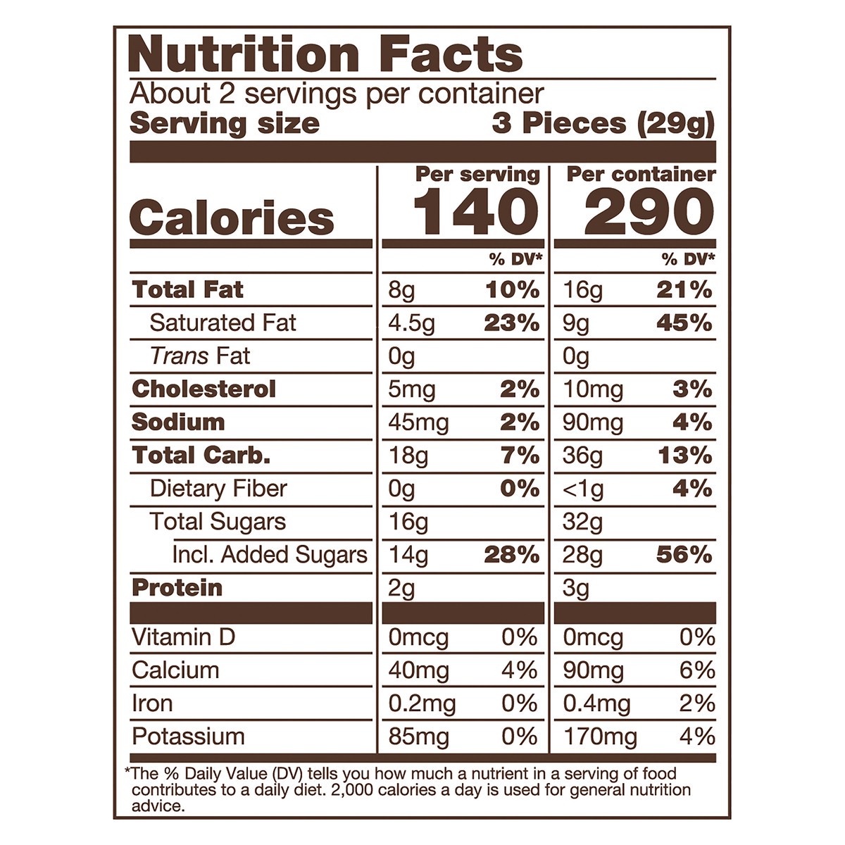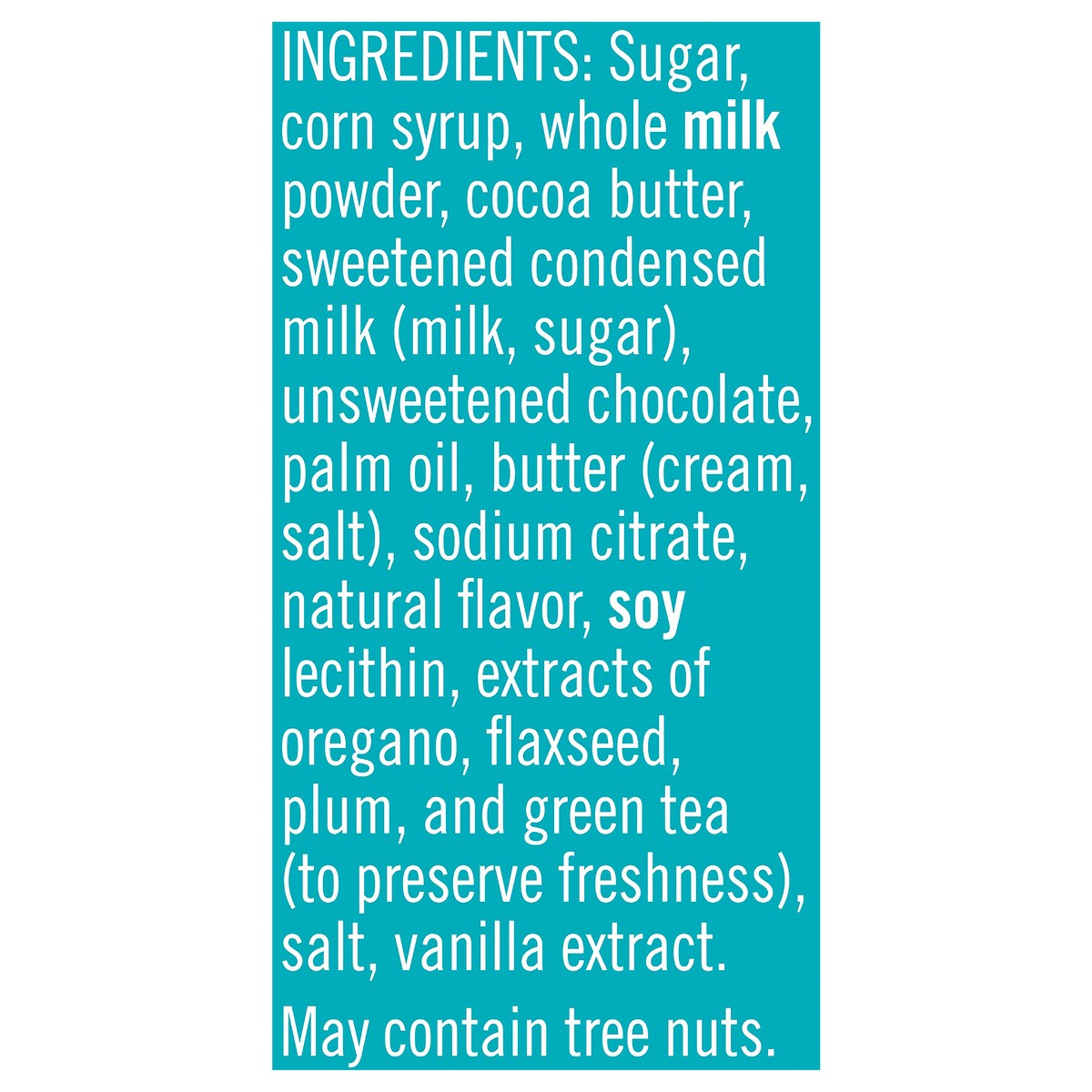 Sugar, Corn Syrup, Whole Milk Powder, Cocoa Butter, Sweetened Condensed Milk (Milk, Sugar), Unsweetened Chocolate, Palm Oil, Butter (Cream, Salt), Sodium Citrate, Natural Flavor, Soy Lecithin, Extract…