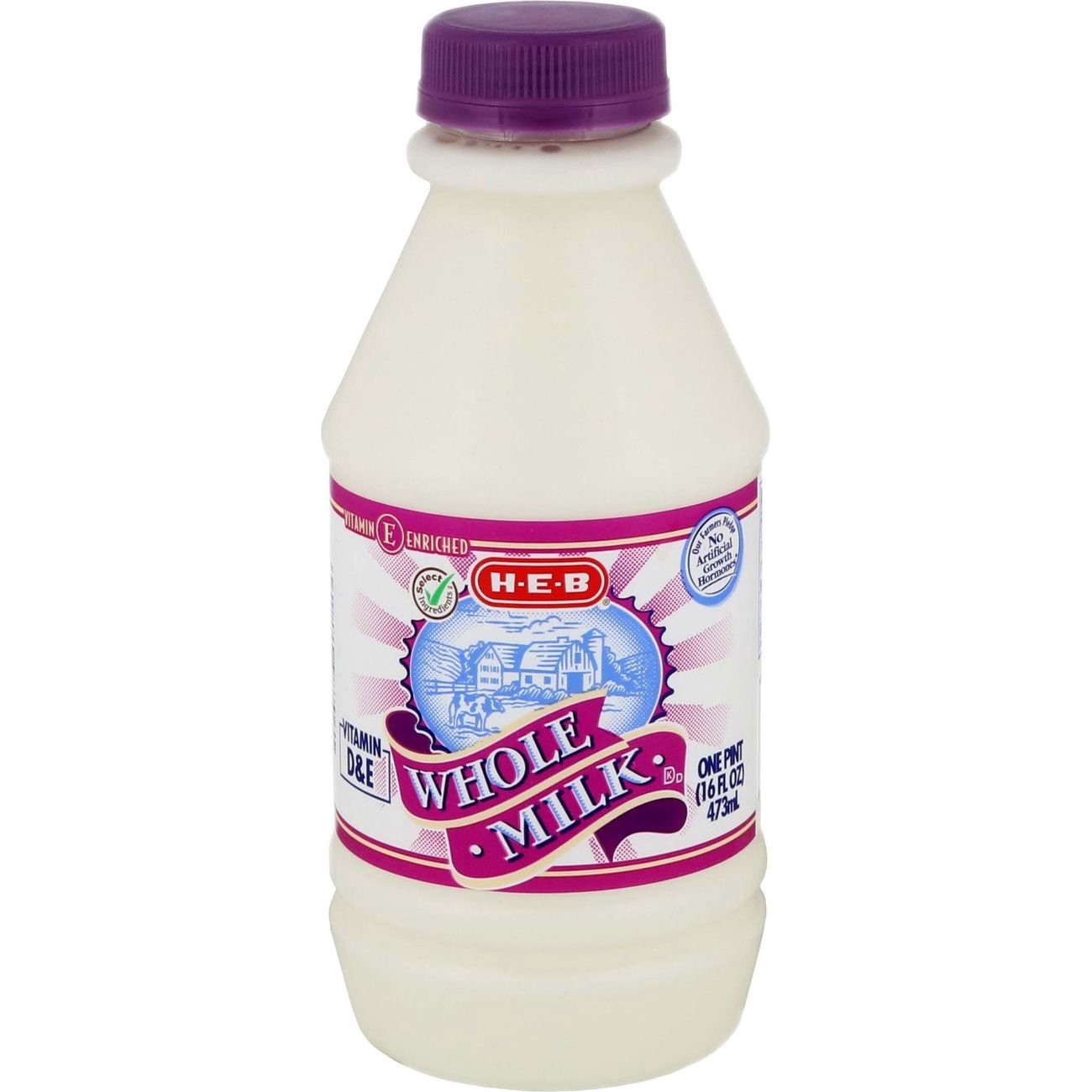 A convenient-sized bottle for when you just need a little bit and not a whole gallon, this pint of H-E-B whole milk is made in Texas by farmers who pledge no artificial growth hormones (rBST).* Enrich…