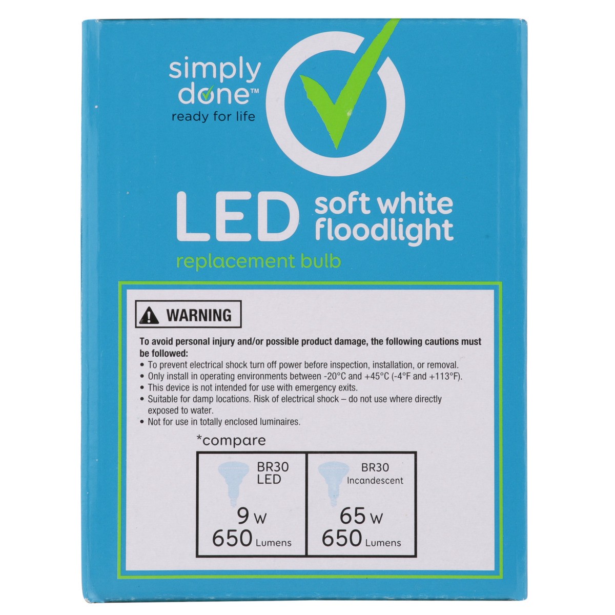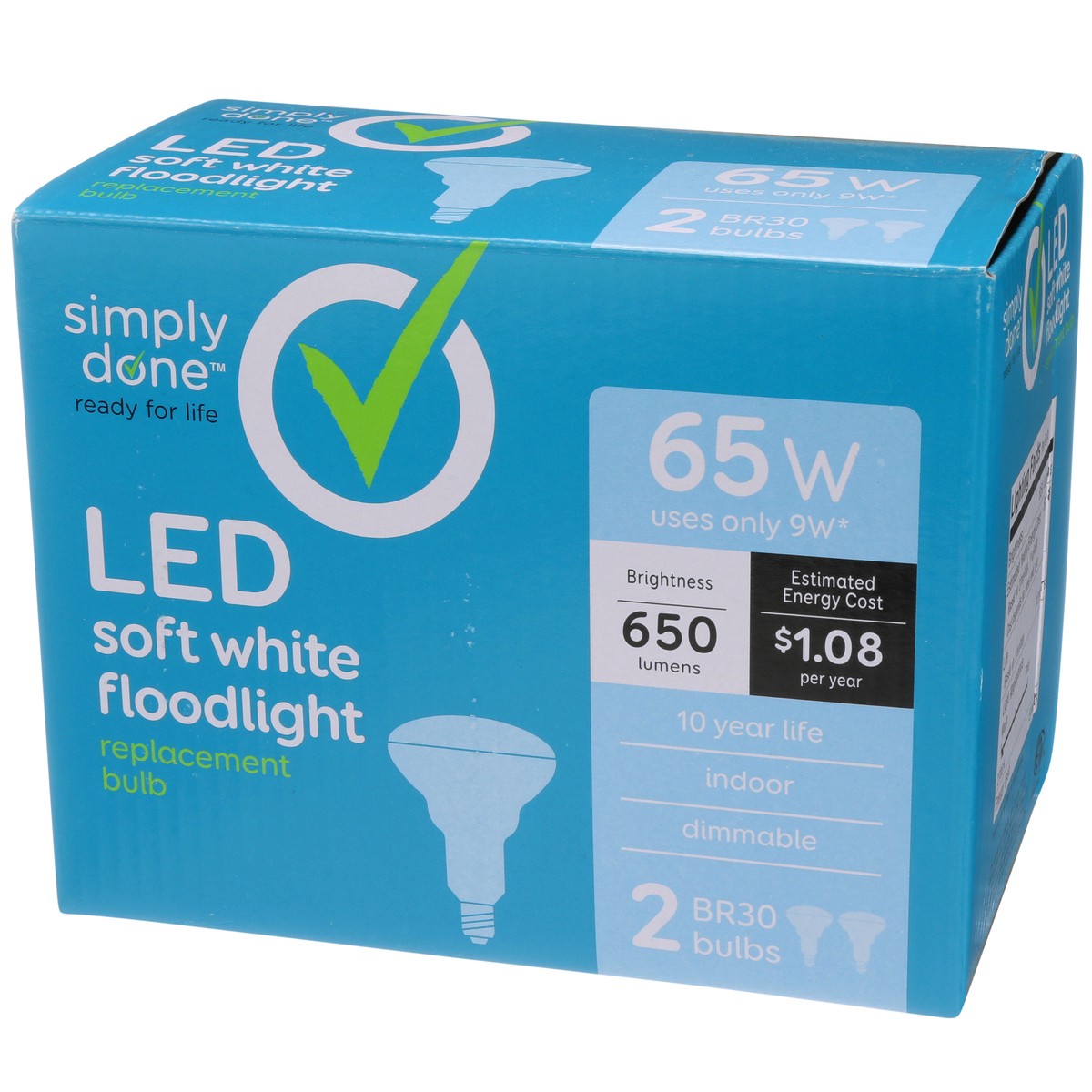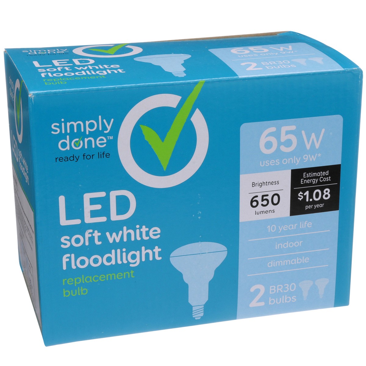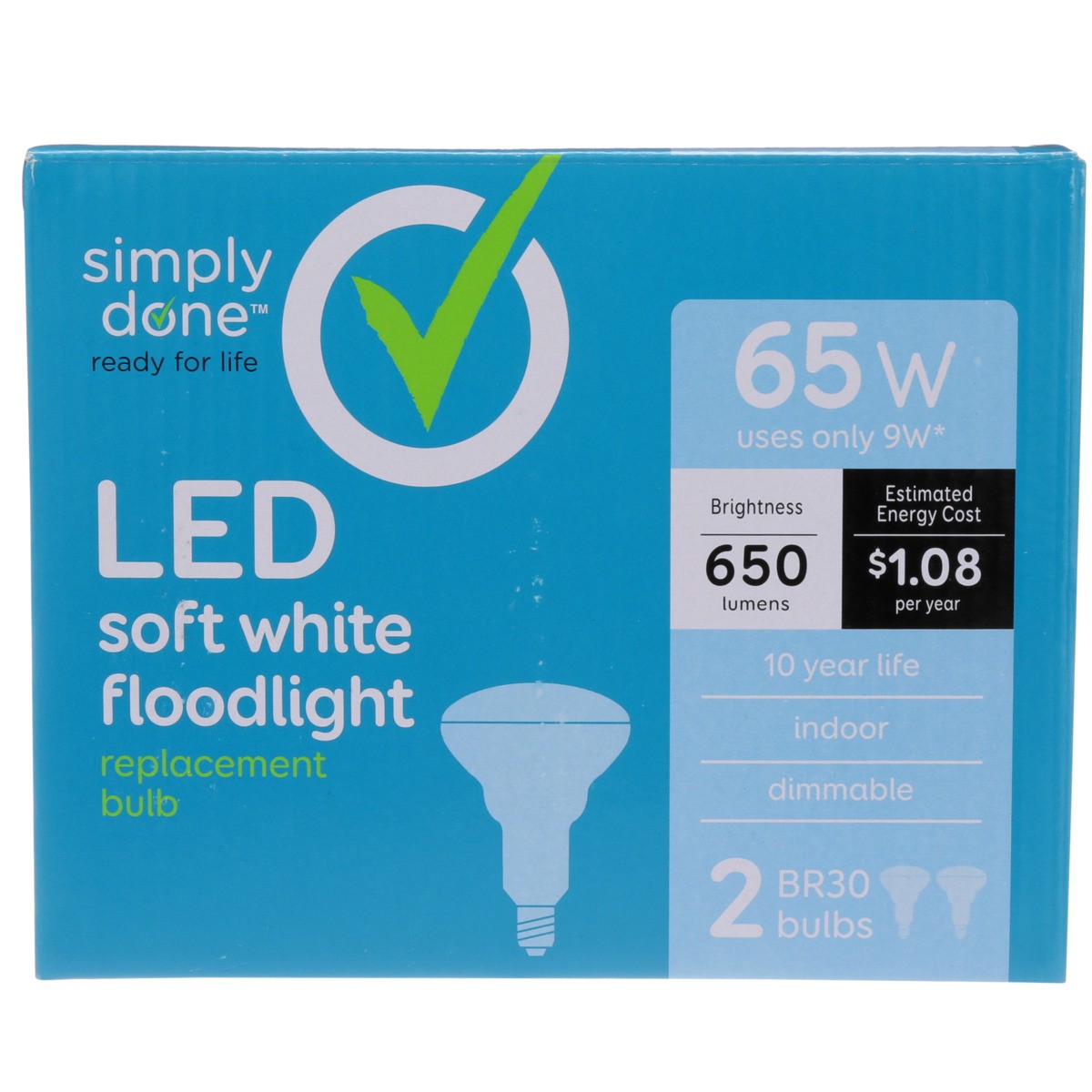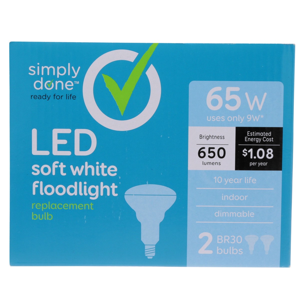 Brightness Quantity: 650 lumens. Energy Info: $1.08 Based on 3 hrs/day, 11 cents/kWh. Cost depends on rates and use. 9 watts. Package Info: 2-Pack. 2. Bulb Info: Indoor. LED. Is Flood Light. Bulb Life…
