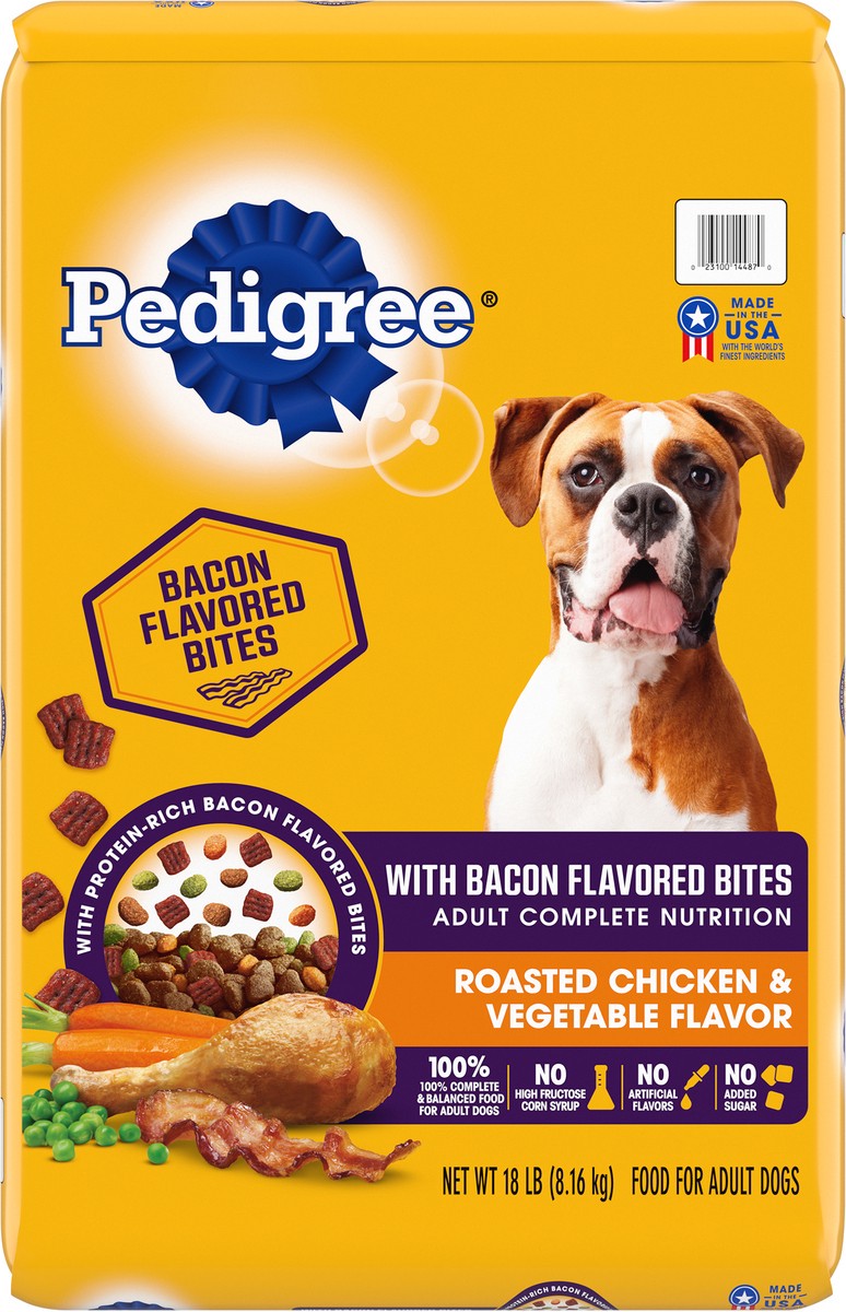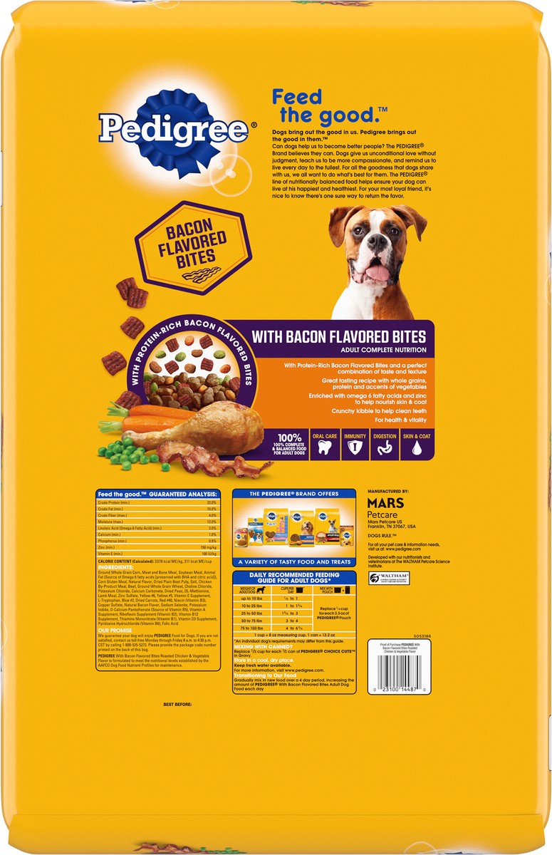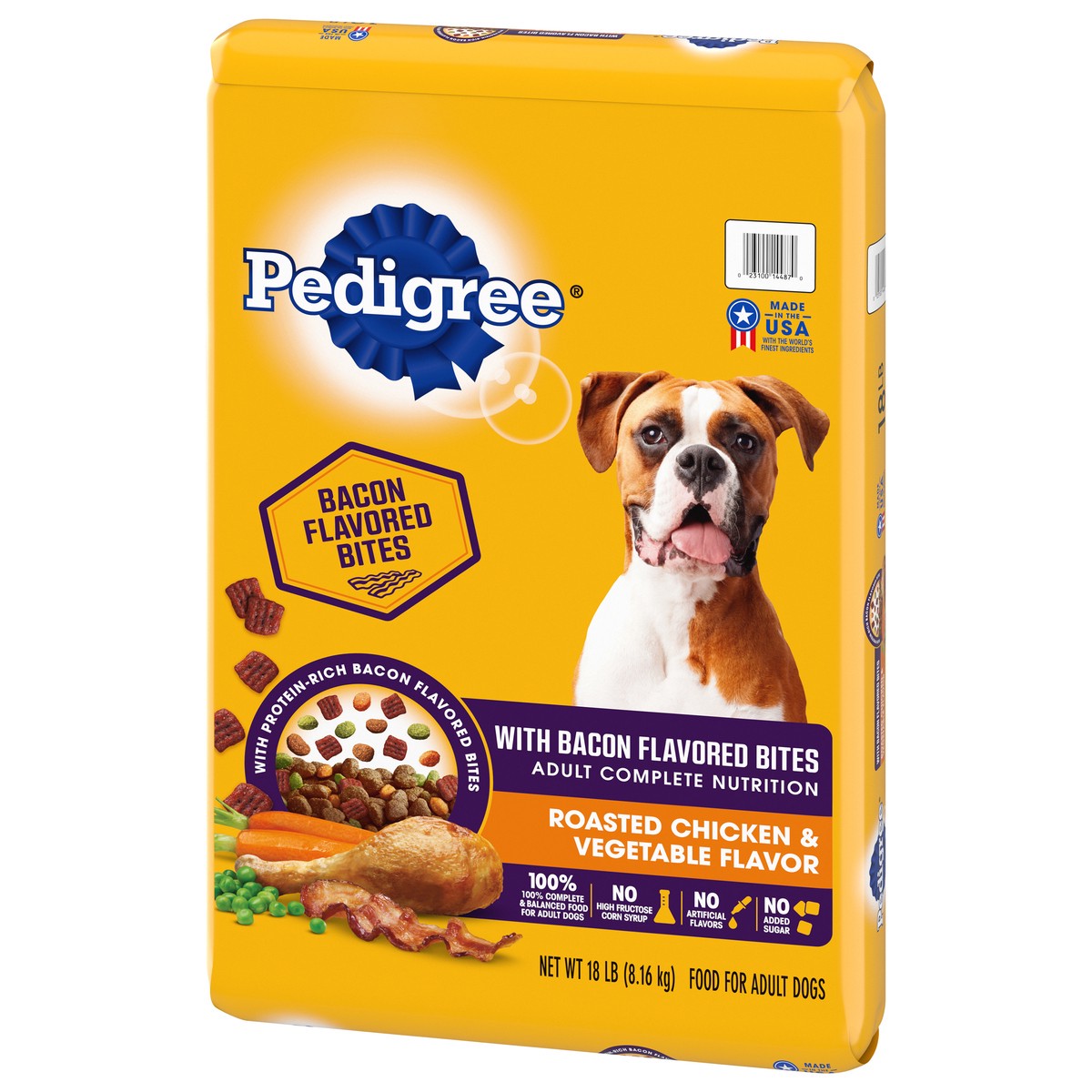 - Complete and Balanced: Pedigree Adult Dry Dog Food Roasted Chicken & Vegetable Flavor With Bacon Flavored Bites is 100% complete and balanced food for adult dogs