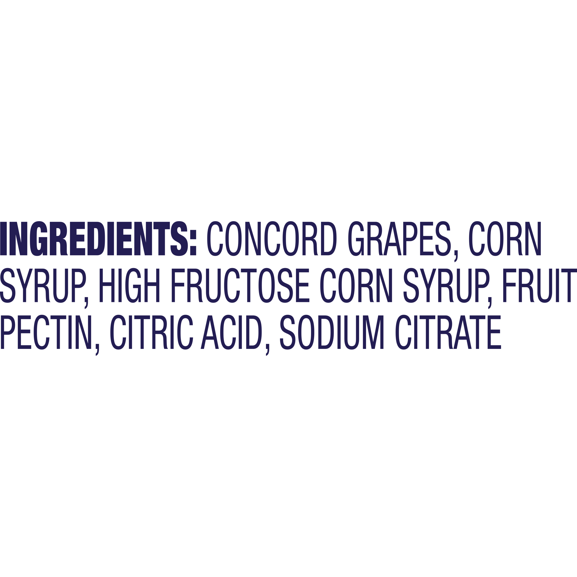 Concord Grapes, Corn Syrup, High Fructose Corn Syrup, Fruit Pectin, Citric Acid, Sodium Citrate.