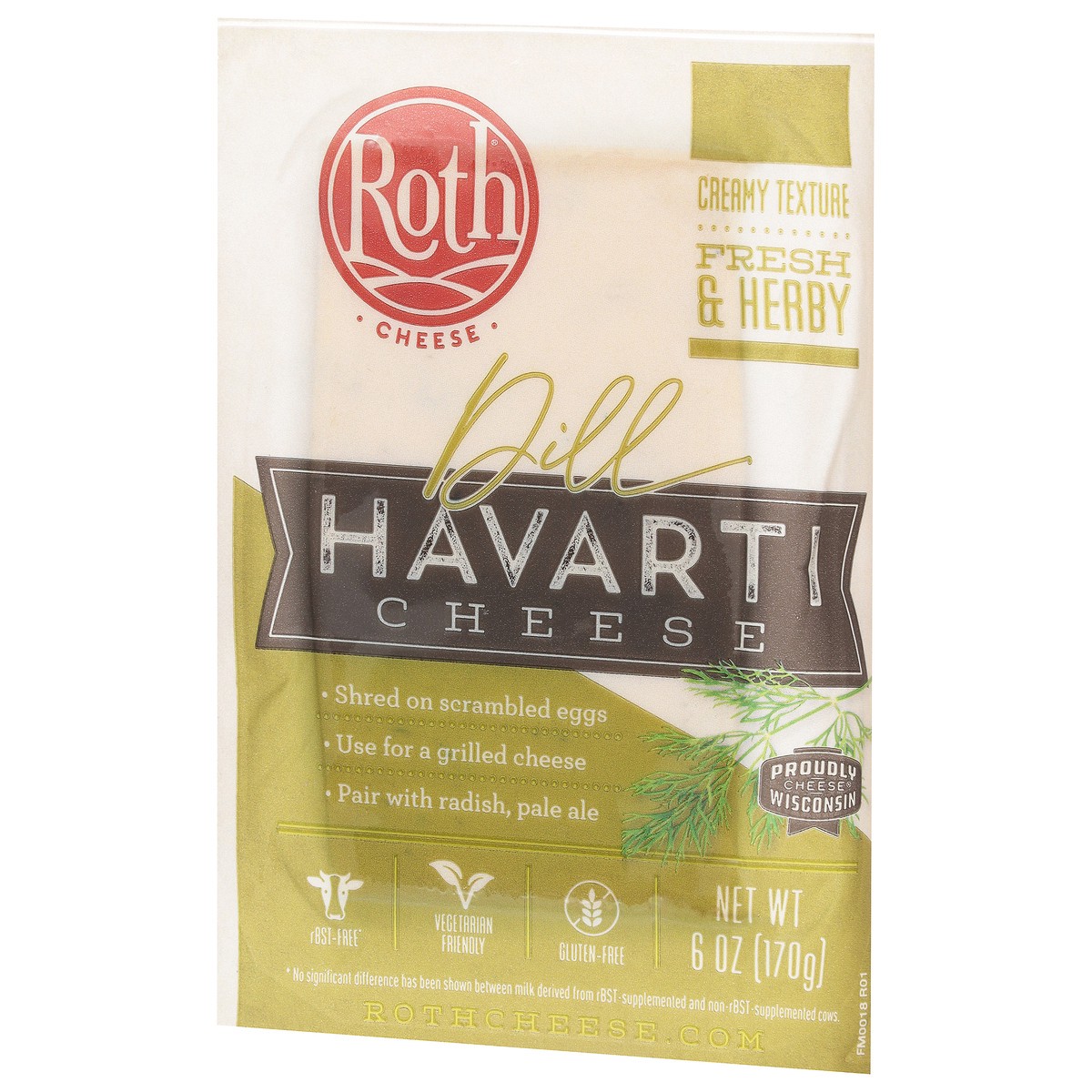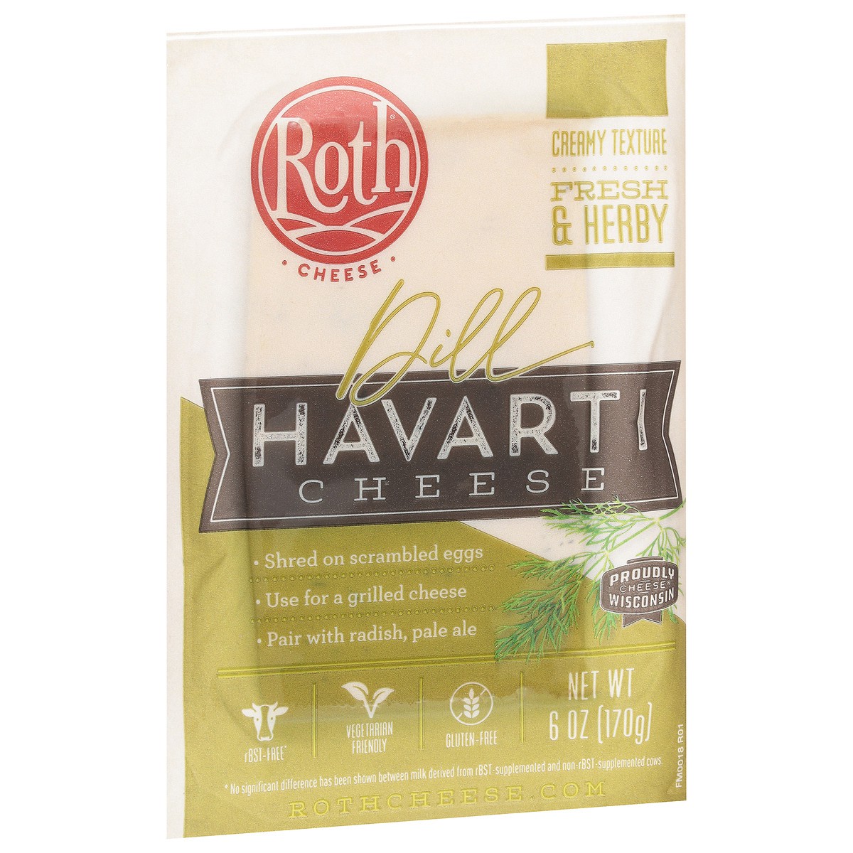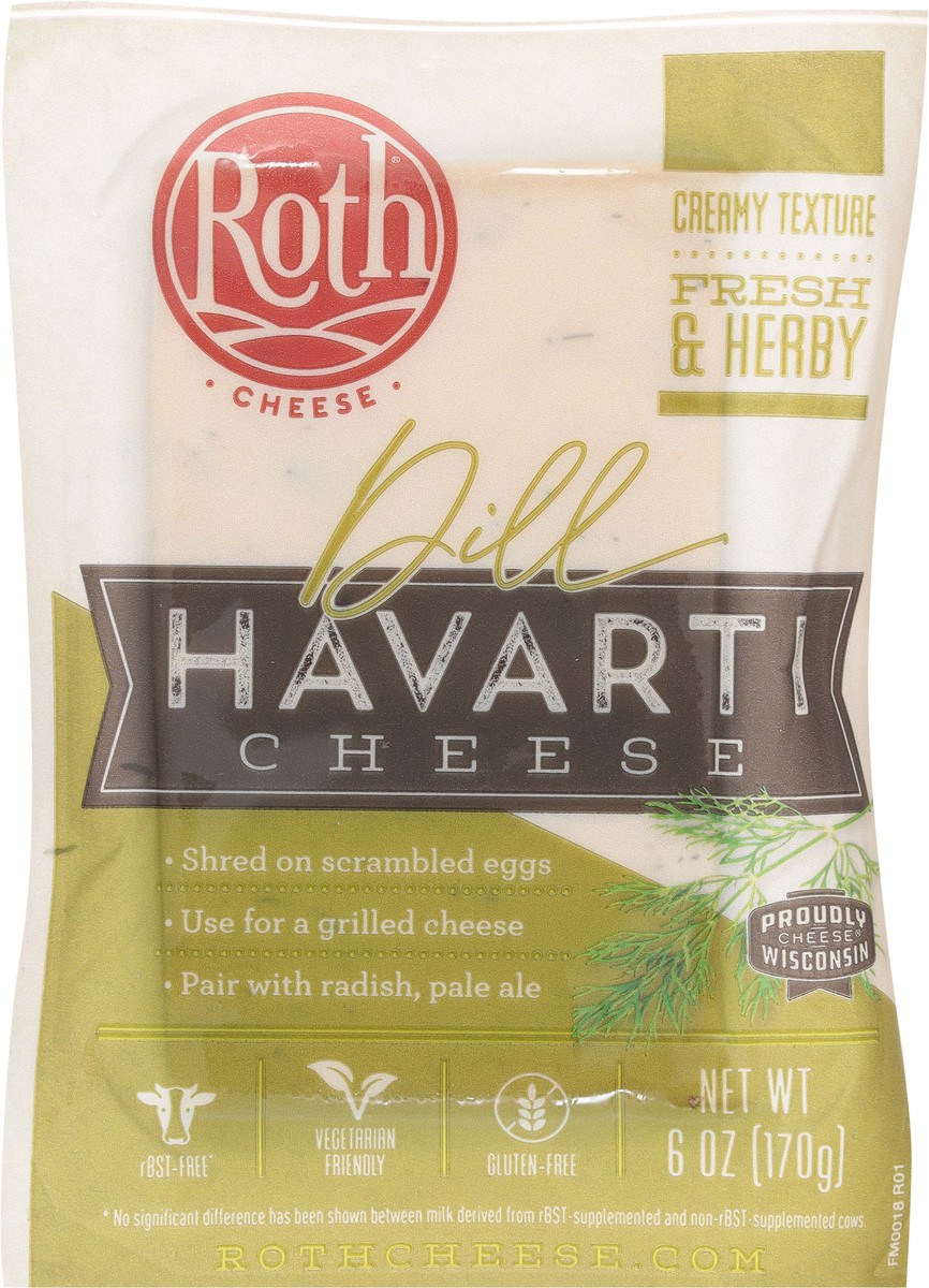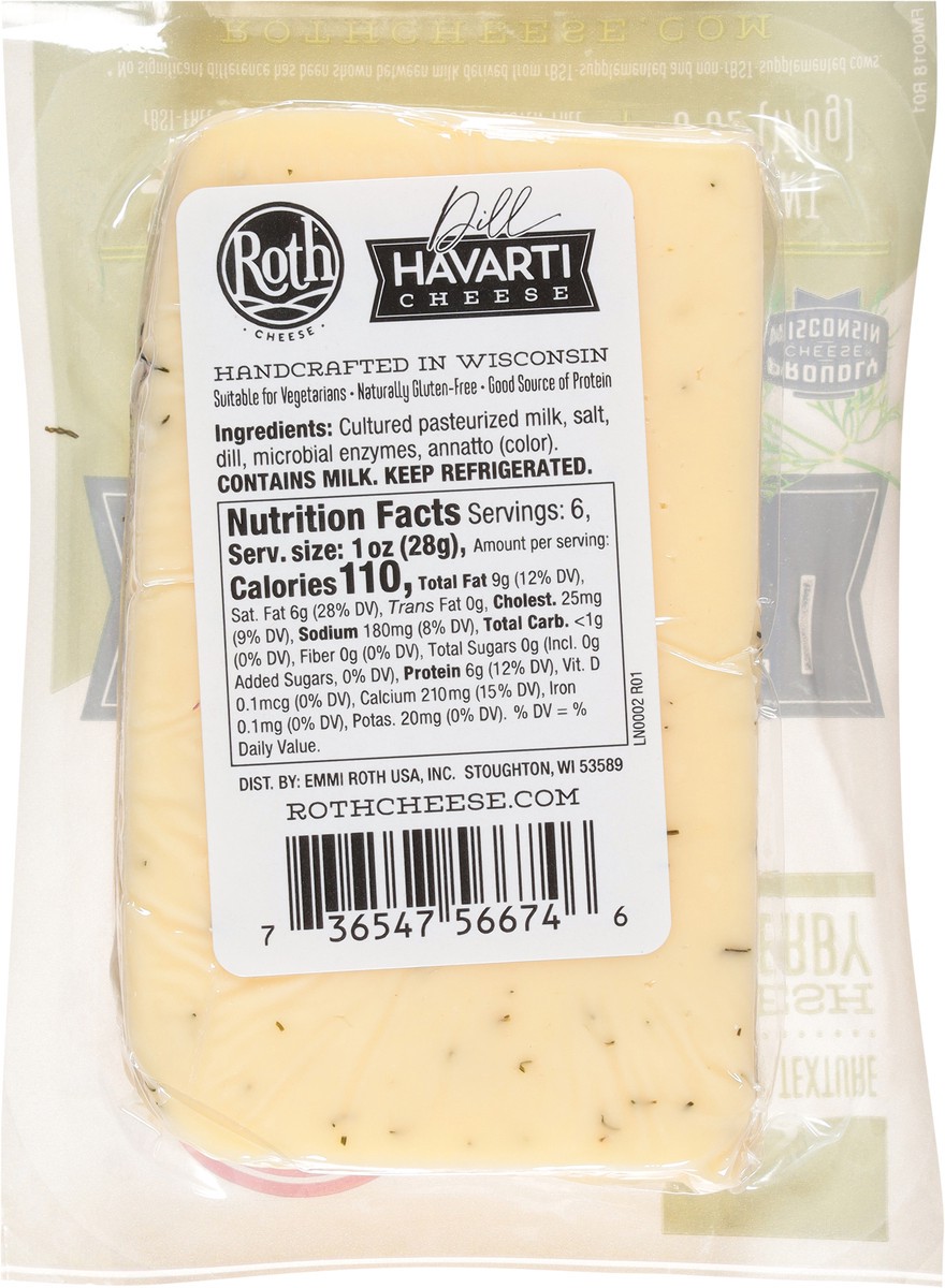 Roth Dill Havarti 6 oz is made with the freshest Wisconsin milk and traditional methods of danish cheese making. This popular cheese is creamy, subtle with a savory finish and delicious for snacking o…