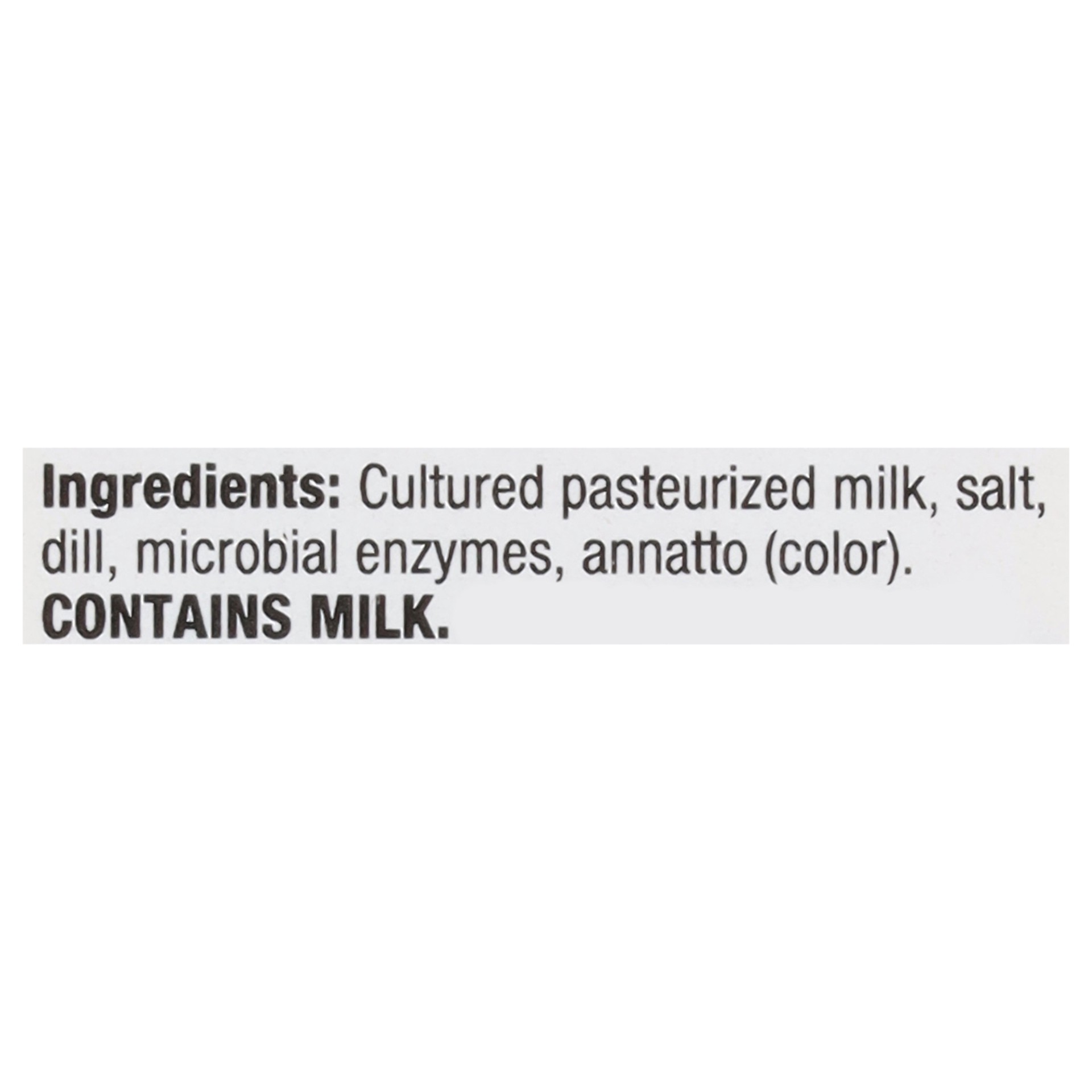 Cultured Pasteurized Milk, Salt, Dill, Microbial Enzymes, Annatto (Color).