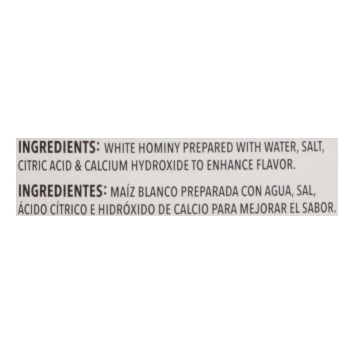 White Hominy Prepared with Water, Salt, Citric Acid and Hydrated Lime to Enhance Flavor.