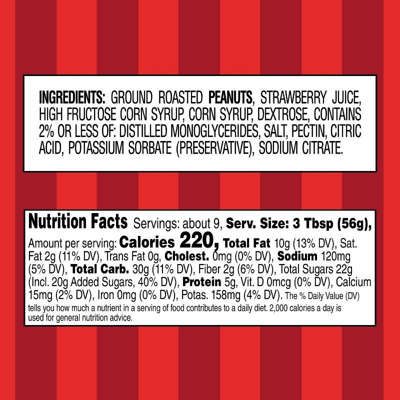 Ground Roasted Peanuts, Strawberry Juice, High Fructose Corn Syrup, Corn Syrup, Dextrose, Contains 2% or Less of: Distilled Monoglycerides, Salt, Pectin, Citric Acid, Potassium Sorbate (Preservative),…