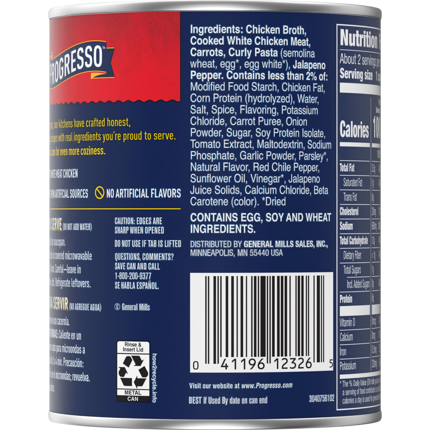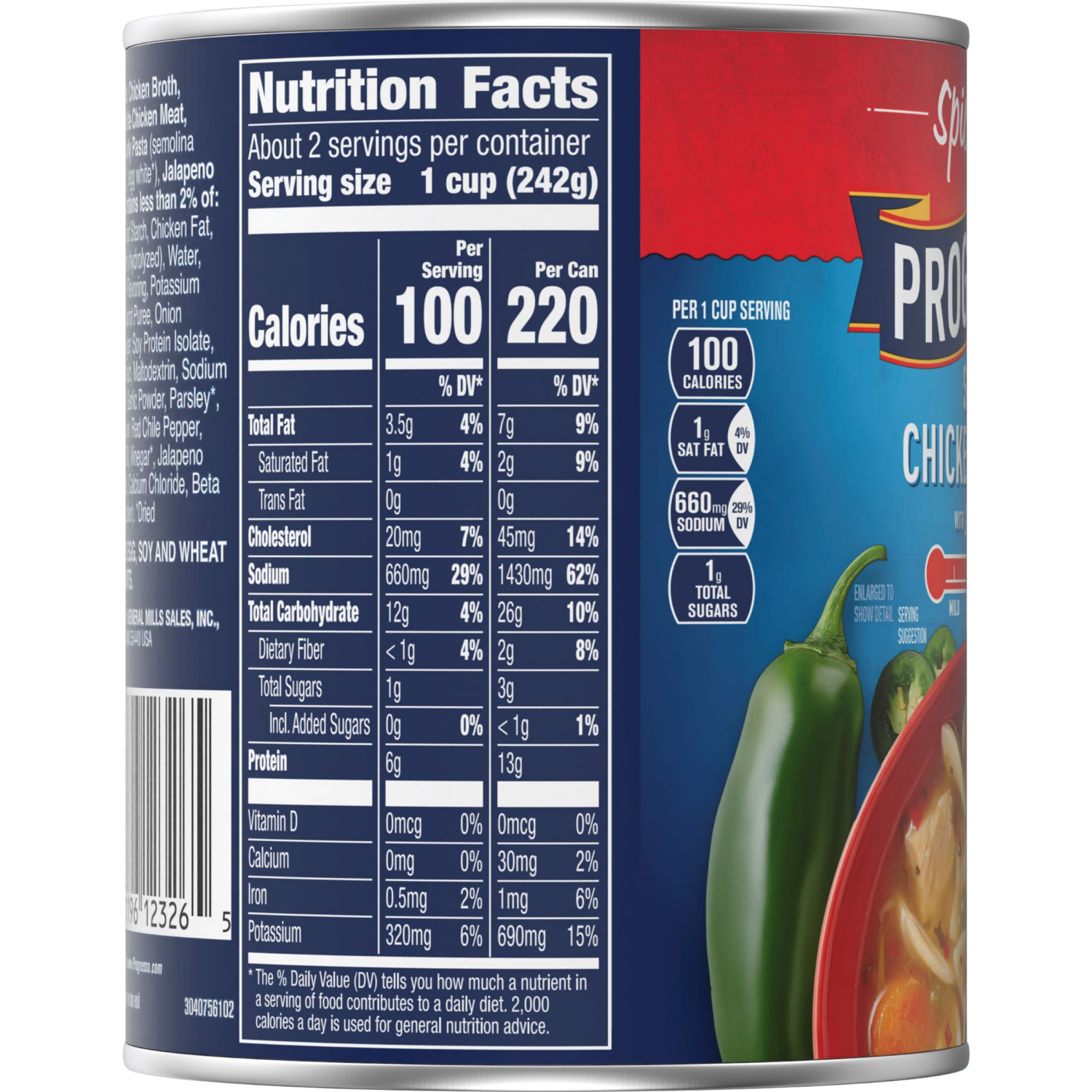 Chicken Broth Cooked White Chicken Meat, Carrots, Curly Pasta (Semolina Wheat, Wheat Flour, Egg (Dried)), Jalapeno Pepper. Contains less than 2% of: Modified Food Starch, Chicken Fat, Corn Protein (Hy…