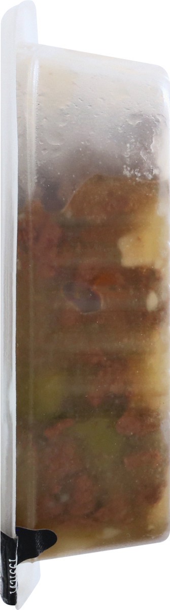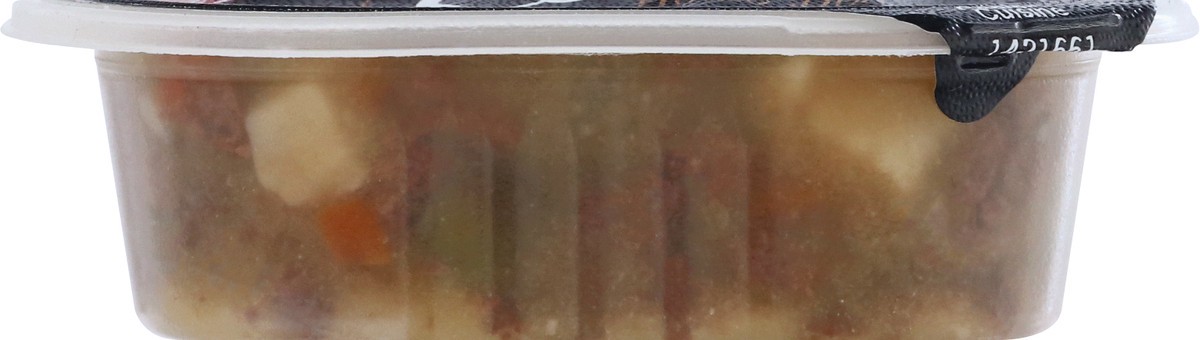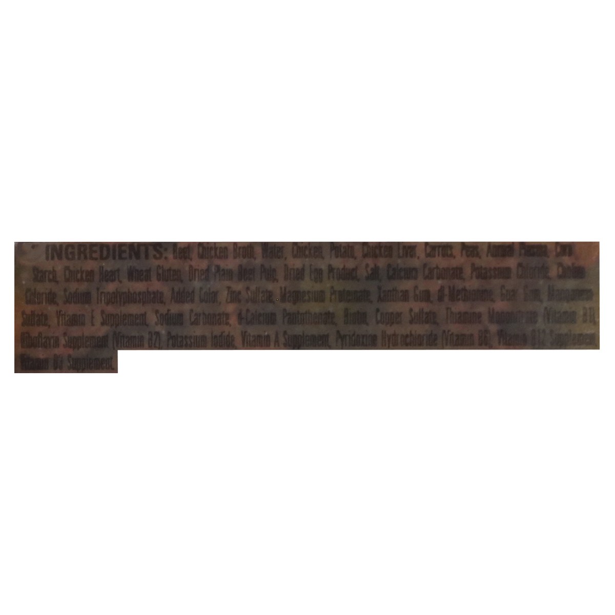 Beef, Chicken Broth, Water, Chicken, Potato, Chicken Liver, Carrots, Peas, Animal Plasma, Corn Starch, Chicken Heart, Wheat Gluten, Dried Plain Beet Pulp, Dried Egg Product, Salt, Calcium Carbonate, P…