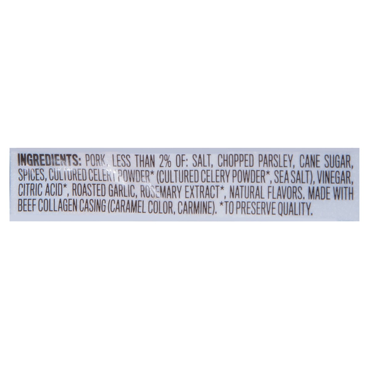 Pork, Less than 2% of: Salt, Chopped Parsley, Cane Sugar, Spices, Cultured Celer Powder (to Preserve Quality) (Cultured Celery Powder (to Preserve Quality), Sea Salt), Vinegar, Citric Acid (to Preserv…